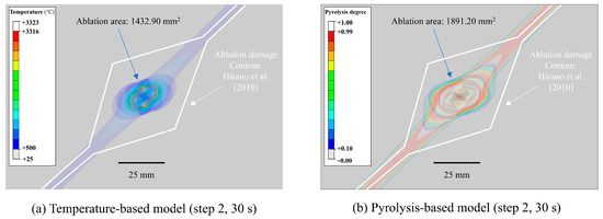 The in-plane damage footprints obtained from (a) temperature-based model and (b) pyrolysis-based model. Data from Hirano et al. are included for reference [2].