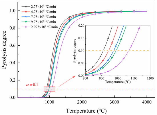 Based on the assumption of linear heating, pyrolysis kinetics analysis was conducted to obtain the pyrolysis degree-temperature curves of composite materials at different heating rates, as shown in Figure 6. As the heating rate increases, the pyrolysis curve gradually shifted toward the high-temperature region. The abscissa of the intersection points between the pyrolysis degree of 0.1 and the pyrolysis degree-temperature curves at different heating rates means that the pyrolysis degree of the material reaches 0.1 at that temperature. Table 3 listed the temperature at which the pyrolysis degree reaches 0.1 at different heating rates. When the heating rate was °C/min, the corresponding pyrolysis starting temperature was 910.09 °C, but the actual temperature of the material was 300 °C. Only when the starting temperature of material pyrolysis is less than or equal to the current temperature of the material will pyrolysis occur. So, the material will not be damaged at 300 °C, and when the temperature was equal or greater than 1000 °C, the material will begin to undergo pyrolysis, as shown in Table 3. Although many studies have recognized that the heating rate affects the pyrolysis of composite materials, the starting temperature of pyrolysis at lower heating rates was still used as the threshold to predict lightning strike damage [6,16,28]. These finding challenges conventional assumptions about heating rate limitations in such materials. The kinetic parameters (A, E, n) used in the pyrolysis-based model were determined through standard thermogravimetric analysis (TGA) experiments at relatively low heating rates. The validity of these parameters is a fundamental assumption of the pyrolysis-based model. However, due to current technical limitations, it is challenging to perform thermogravimetric analysis under extreme heating rates. Consequently, the applicability of these parameters to lightning strike conditions requires further investigation. Previous studies [6,17,20,24,28,36,41] also use the kinetic parameters determined by standard thermogravimetric analysis experiments to evaluate and analyze lightning ablation damage. Therefore, this issue is the core problem and technical challenge faced in the numerical simulation of lightning damage to composite materials. These findings are based on a theoretical analysis under linear heating rates. In actual lightning strike events, the thermal response of materials involves a more complex heating process.