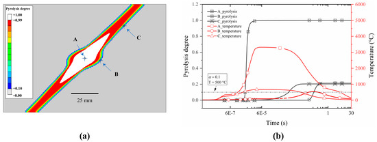 The temporal evolution curves of temperature and pyrolysis degree at characteristic locations on the laminate top surface: (a) schematic diagram of characteristic point locations in the pyrolysis-based model and (b) time history curves of pyrolysis degree and temperature at points A, B, and C.