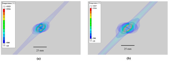 It is reasonable to use damage area and damage depth to evaluate the differences between temperature- and pyrolysis-based models, but these indicators do not truly reflect the inherent differences between these two models. The temperature of a material is related to its internal energy, while the pyrolysis degree of a material is a function of temperature, time, and heating rate. The temperature-based model cannot effectively consider the effect of heating rate on thermal damage, and empirical values of 300 °C [16] or 500 °C [25] were used. Therefore, authors analyzed the differences in lightning strike damage at heating rates of 10,000 °C/min, 15,000 °C/min, and 20,000 °C/min [28]. However, the actual heating rate of composite materials in lightning strike simulation was much higher than these, which can be validated by the experiment [5]. Take the 1600 °C as an example, under the load of lightning current, assuming that the material linearly heats up from 25 °C to 1600 °C within 400 μs, with an average heating rate of up to °C/min. In the numerical simulation model, step 1 represents the heating process of current conduction, while step 2 represents the heat dissipation process after the end of current conduction. In order to analyze the inherent differences between temperature- and pyrolysis-based models, the commonly used temperature thresholds (300 °C, 500 °C, 800 °C, 1000 °C, and 3000 °C) for temperature-based models were selected as a reference to calculate material heating rates in step 1.