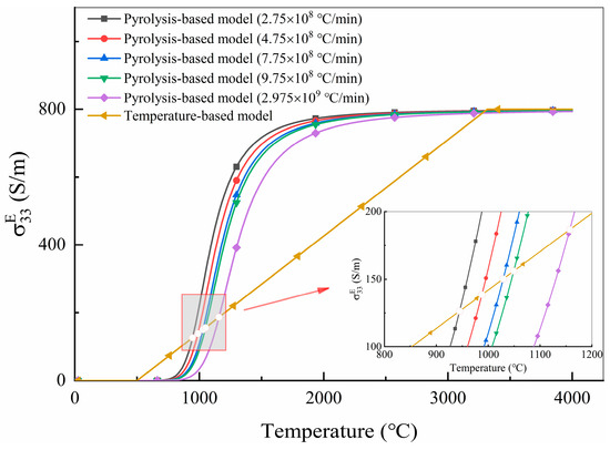 In Table 1, the electrical conductivity along the fiber direction remains unchanged, while the electrical conductivity perpendicular to the fiber direction changes dramatically with temperature or pyrolysis degree. Based on the given material parameters, the temperature-based model employed in this study assumes a linear change [16] in electrical conductivity with temperature of 500 °C to 3316 °C, while the pyrolysis-based model assumes a linear change [17] in electrical conductivity with pyrolysis degree from 0 to 1. To compare the differences in electrical conductivity between the temperature-based model and the pyrolysis-based model during lightning strike, a pyrolysis kinetics analysis based on the linear heating assumption was conducted. The electrical conductivity-temperature curves in the thickness direction of these two models under different heating rates were plotted, as shown in Figure 9. Pyrolysis-based model exhibits a significant nonlinear relationship between conductivity and temperature. The intersection means that at a given heating rate, the electrical conductivity of these two models in the thickness direction is equal at a certain temperature. Table 4 presents the temperature and electrical conductivity values at the intersection of the electrical conductivity-temperature curves for these two models in step 1. At heating rates less than °C/min, indicating material temperatures below 1000 °C in step 1, the intersection temperature exceeded the actual temperature corresponding to the heating rates. Therefore, the electrical conductivity of the pyrolysis-based model between 500 °C and 1000 °C was lower than that of the temperature-based model, while the opposite holds true between 1000 °C and 3000 °C. The transverse electrical conductivity properties were also the same.