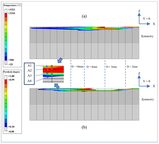 At positions A1 (D = 2 mm and D = 5 mm), a uniform in-plane current is applied as an initial condition. As material temperature increases, the temperature-based model exhibits earlier enhancement of through-thickness conductivity, causing a significant reduction in overall resistance. This facilitates current penetration and expansion of the conduction network. In contrast, the pyrolysis-based model demonstrates delayed through-thickness conductivity development due to heating rate effects, maintaining predominant surface current flow. This concentrated current generates intensified Joule heating, leading to a rapid temperature rise. This rise subsequently accelerates the through-thickness growth of electrical conductivity, causing it to exceed the predictions of the temperature-based model. Therefore, when current begins to conduct through the laminate thickness, the pyrolysis-based model demonstrates significantly delayed conductivity compared to the temperature-based model. With an initial through-thickness conductivity of only 0.0018 S/m, the maximum conductivity difference between these two models reaches two orders of magnitude (100 times) in the thickness direction. Although the pyrolysis-based model’s conductivity eventually surpasses the temperature-based model in later stages, the maximum excess remains below 10-fold. These mechanisms result in substantially lower effective through-thickness conductivity in the pyrolysis-based model’s first layer, promoting preferential shallow current flow that generates larger damage areas. When A1 approaches ablation completion, current gradually transfers to underlying layers, inducing temperature rise at A2. Nodes A2 and A3 exhibit analogous through-thickness conductivity evolution patterns to A1. This process repeats at A2/A3 positions (D = 8 mm and 10 mm). Consequently, the heating rate-induced conductivity delay in the pyrolysis-based model fundamentally explains its prediction of larger damage areas but shallower depths.