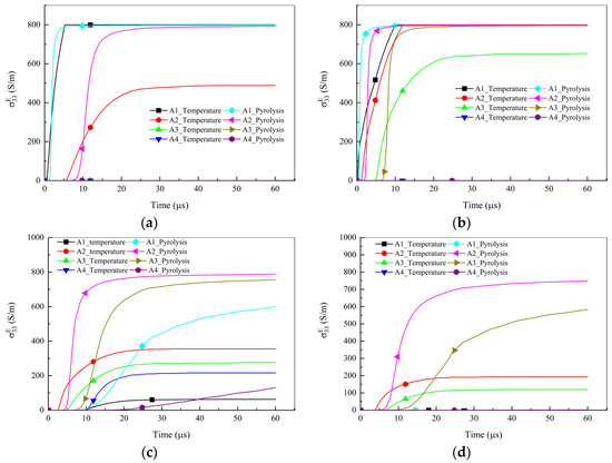 In this study, the electrical conductivity of the material in the thickness direction is dependent on temperature and degree of pyrolysis. Based on this correlation, the real-time temperature and pyrolysis degree of each node can be converted into corresponding conductivity values, thereby enabling the reconstruction of spatially resolved real-time conductivity profiles throughout the material, as shown in Figure 11. Consistent with the linear heating analysis results, at the same location, the temperature-based model initially exhibits a higher electrical conductivity than the pyrolysis-based model. However, the conductivity predicted by the pyrolysis-based model then increases rapidly and eventually surpasses that of the temperature-based model. The conductivity stabilizes at 30 μs, as the lightning impulse current decays rapidly and the material temperature shows no significant variation beyond this time point.