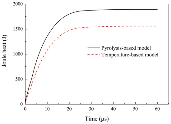 As shown in Figure 13, the pyrolysis-based model generated about 1892.13 J of total Joule heat, which is about 334.59 J more than the temperature-based model (1557.54 J). This finding is a direct consequence of the delayed through-thickness conductivity development identified earlier. During the critical initial phase of current conduction, the pyrolysis-based model exhibits significantly lower through-thickness conductivity (Figure 11), resulting in a higher overall resistance. For a prescribed current waveform, this increased resistance naturally leads to greater cumulative Joule heating, as quantified here.