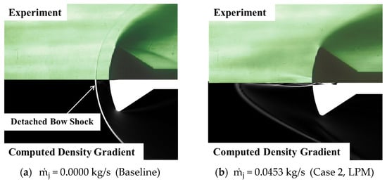 Figure 5b compares the predicted and experimental shock stand-off distance. As the total jet pressure increases, the degree of under-expansion of the jet increases, and the flow structure becomes more steady and more stable [35]. Therefore, the predicted distance of the detached bow shock gradually gets closer to the experimental data [20].