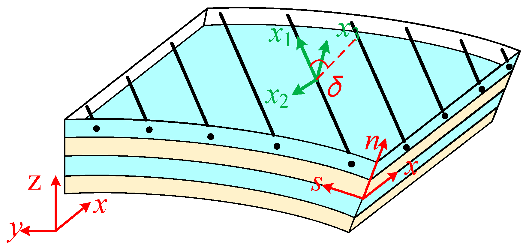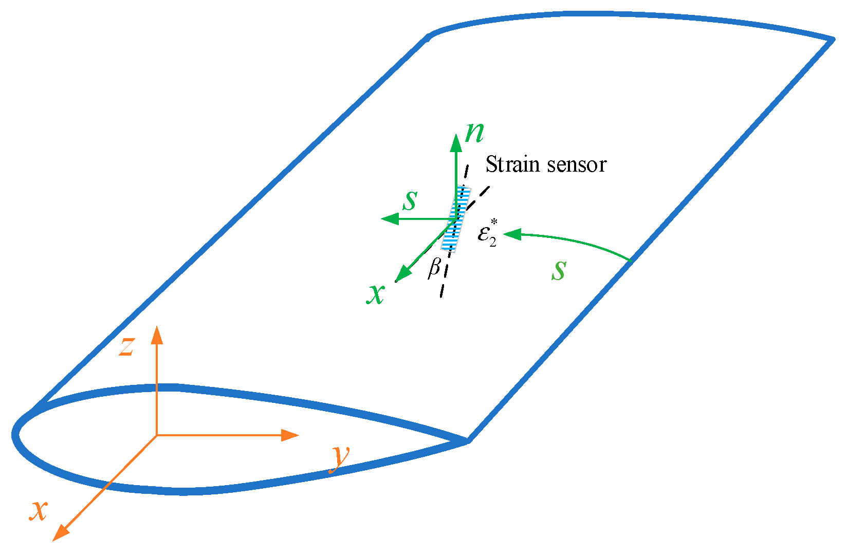 Consider a straight-line smart skin wing-shaped beam with a constant cross-sectional geometry. For the global structure, an orthogonal Cartesian coordinate system (