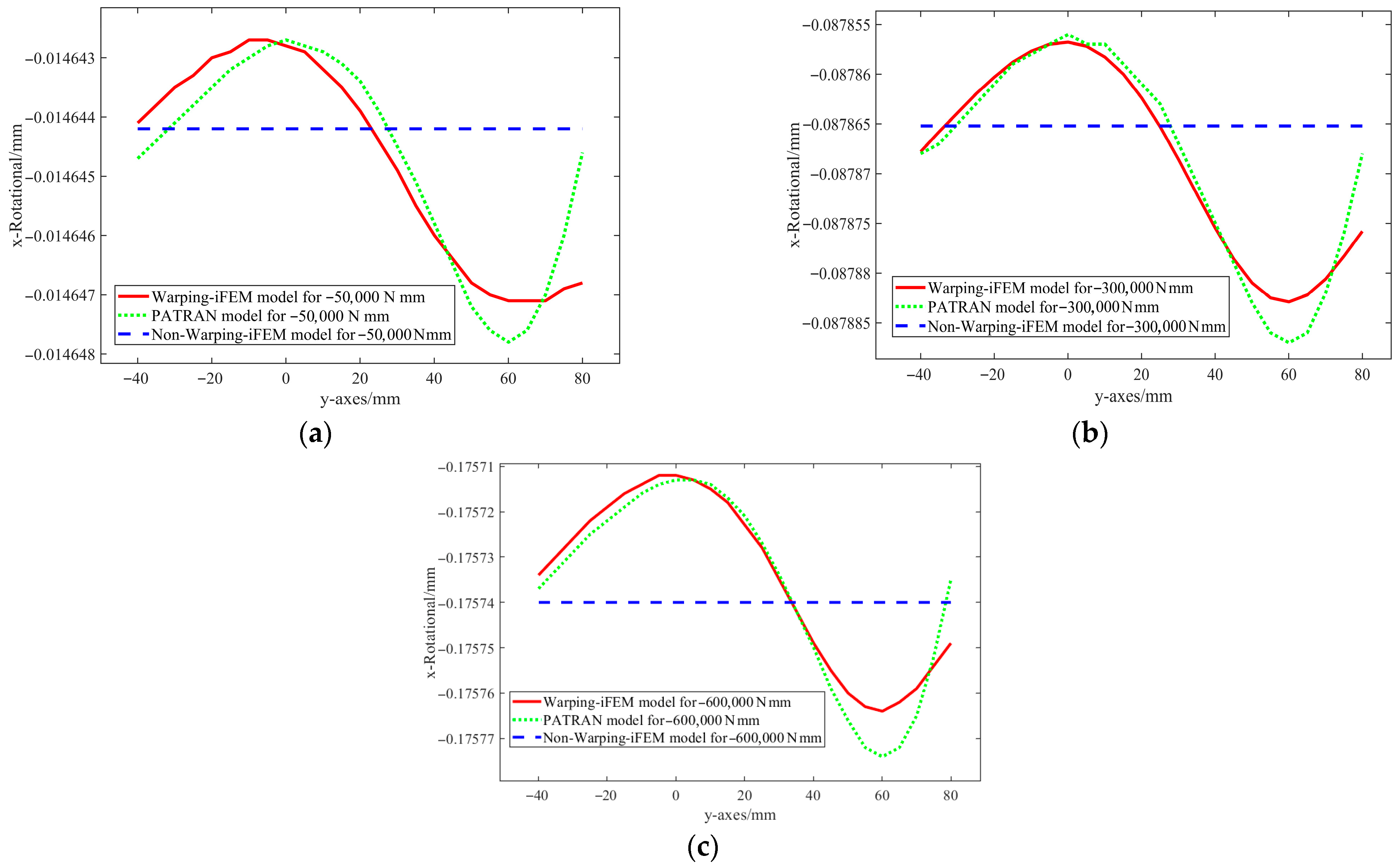 y-axis, which is highly consistent with the Patran 2020 results. In contrast, the Non-Warping-iFEM results approach a horizontal distribution, with significant deviations from the finite element solution, indicating that neglecting the warping effect underestimates the local torsional deformation. Furthermore, under different loading conditions (Mx = −50,000 N·mm, −300,000 N·mm, and −600,000 N·mm), the fluctuations in the twist angle caused by warping increase with increasing load, in accordance with the physical laws of structural twist deformation. Therefore, considering the warping effect is crucial for accurately predicting the torsional deformation of wing cross-sections.