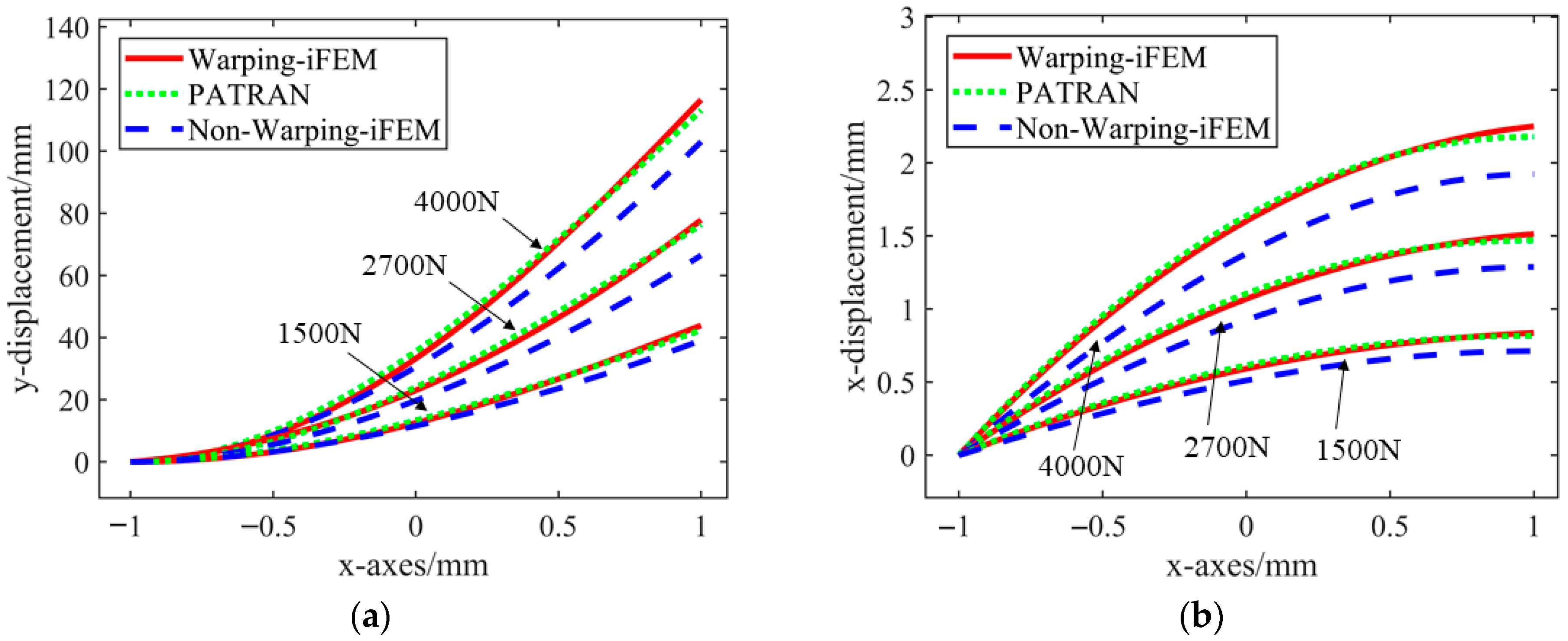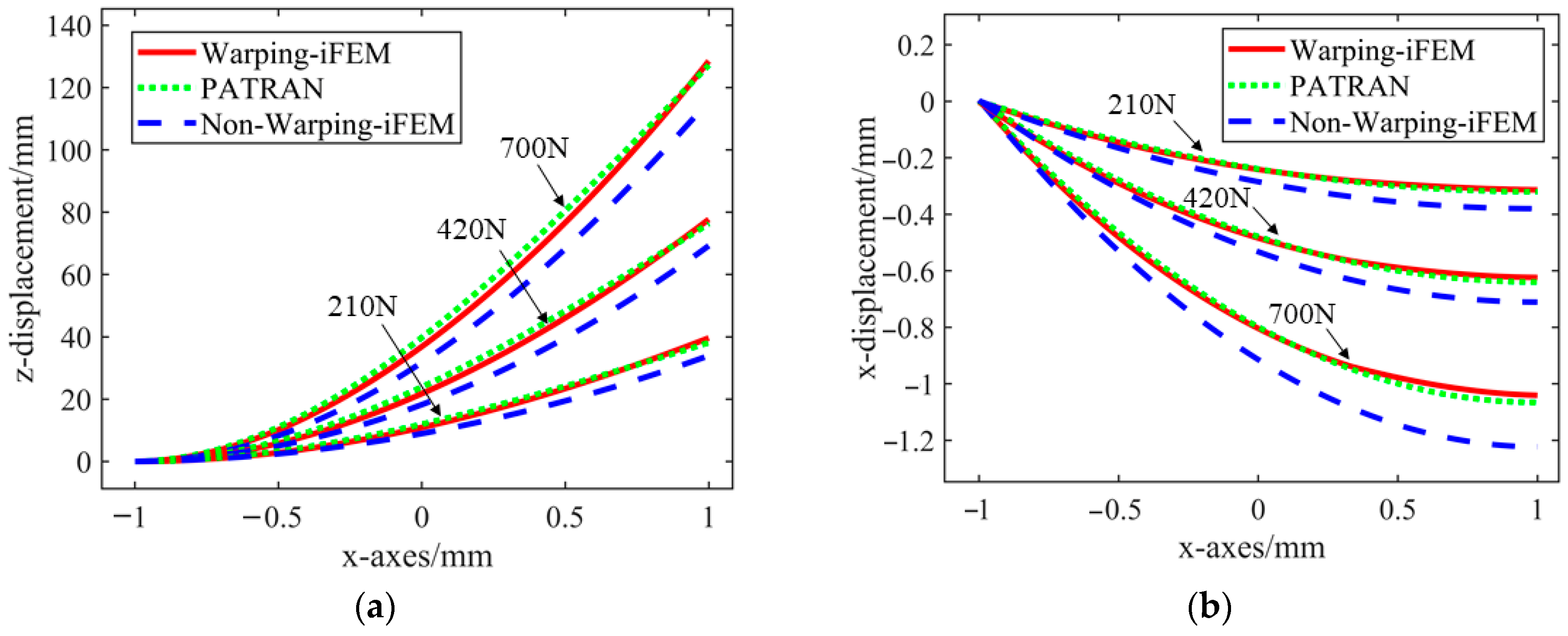 Figure 10 reveal that the Warping-iFEM method proposed in this paper more accurately matches the theoretical displacement curves in three directions (