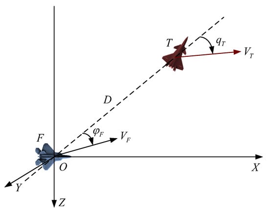 Taking one-on-one operation as an example, the dual-aircraft geometric situation is shown in Figure 1. To illustrate the air situation between the enemy and us more clearly, this study uses the aircraft coordinate system, . In the figure, and represent the aircraft and enemy aircraft, respectively; represents the target line, that is, the line from our aircraft to the enemy aircraft; is the relative distance between the enemy and our aircraft; is the relative altitude, that is, the altitude difference between the enemy aircraft and our aircraft; and represent the speed of our aircraft and that of the enemy aircraft, respectively; represents the azimuth of our aircraft; represents the target entry angle; it is stipulated that the right aversion of the target’s entry angle and the azimuth angle of our aircraft is positive, and the left aversion is negative.