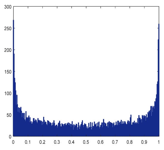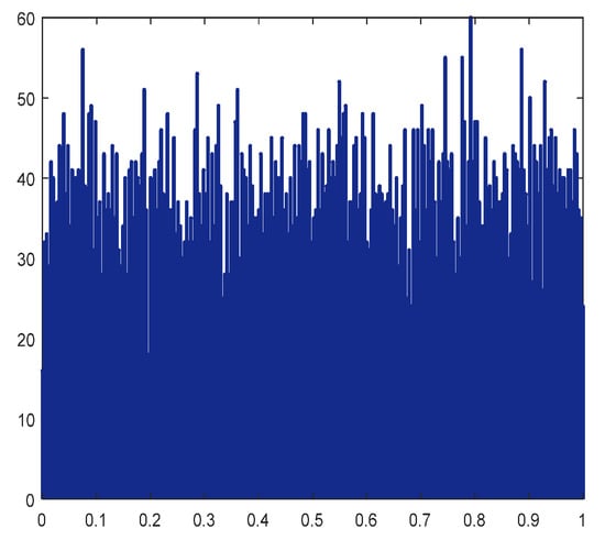 where denotes the chaotic adjustment coefficient. When its value is , the logistic mapping model exhibits chaotic characteristics. Therefore, in this study, is used, where is a random number and . Using , denotes the initial mapping value. After 10,000 iterations of the logistic mapping and the random mapping, the distribution of the chaotic sequences in the two-dimensional space is shown in Figure 5 and Figure 6.