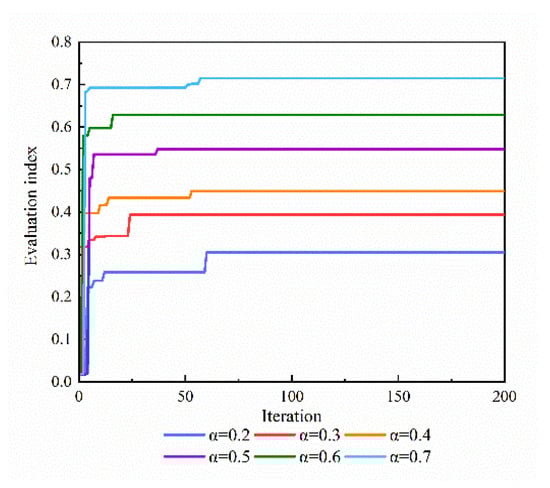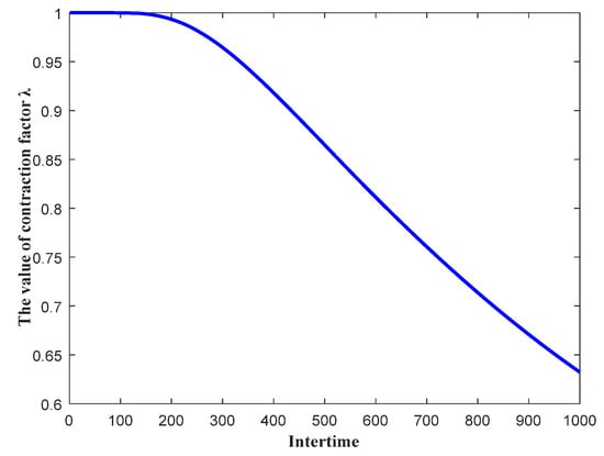 where is the current number of iterations of the algorithm and controls the contraction rate. The contraction rate decreases as increases. According to Equation (31), the contraction rate was set to in this study. The variation process of the contraction control parameter over 1000 algorithmic iterations is shown in Figure 7.