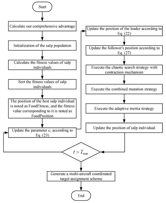 The primary contributions lie in two dimensions: model construction and algorithmic improvement. Model-wise, this work overcomes the limitations of traditional single-aircraft advantage assessments by establishing a multi-aircraft coordinated advantage assessment model that incorporates formation synergy factors, yielding target assignment outcomes more aligned with real-world operational logic. Algorithmically, three key enhancements were made to the salp swarm algorithm: a chaotic search strategy with a contraction mechanism was introduced to strengthen global exploration capabilities, a Gaussian–Cauchy combined mutation strategy was adopted to improve local exploitation and population diversity, and an adaptive inertia weight mechanism was designed to dynamically balance exploration and exploitation processes. Additionally, a penalty function method seamlessly integrated constraints into the fitness function, simplifying problem complexity. Simulation experiments demonstrate that CMASSA achieves high collaborative operational effectiveness across three typical engagement patterns (m = n, m > n, m < n), exhibiting superior convergence speed and stability to the modified genetic algorithm, particle swarm optimization, and ant colony optimization used for comparison.
