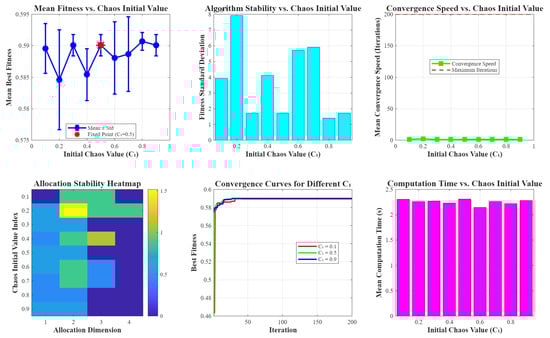 As shown in Figure 7, continued to decrease as the number of iterations of the algorithm increased. According to Equation (30), it can be observed that, as the contraction control parameter continues to decrease, the corresponding chaotic search range continues to decrease. In addition, as can be seen from the convergence curve in Figure 7, the contraction control parameter is relatively large in the early stages of the iteration of the algorithm, which is conducive to expanding the search range of the algorithm. In the late stage of the iteration of the algorithm, gradually decreases, which is conducive to the algorithm avoiding falling into the locally optimal solution and allows the algorithm to further approach the globally optimal solution.