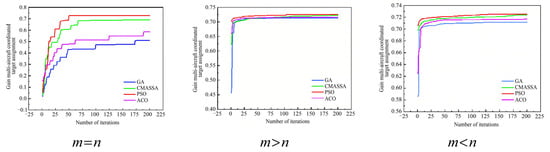 The modified salp swarm algorithm is compared with the modified GA, PSO, and ACO algorithms. The population size, number of iterations, and number of repetitions for all four algorithms were the same when the simulation experiments were performed. Table 14 and Figure 20 and Figure 21 indicate that the CMASSA algorithm obtains the largest gain in the multi-aircraft target assignment strategy, indicating that the target assignment scheme obtained using this algorithm is more reasonable. According to the convergence curve of the algorithm, the CMASSA algorithm had the fastest convergence rate and shortest average running time. The other three algorithms can also obtain a target assignment strategy with a large gain; however, the execution time of these algorithms is too long, and the stability of the optimal schemes obtained by these algorithms is insufficient compared with the CMASSA algorithm. Although the modified GA, PSO, and ACO algorithms address the dilemma of getting stuck in local optima through parameter tuning or strategy introduction, their core mechanisms may still prove inadequate when tackling the multi-constraint target assignment problem described in this paper. The CMASSA algorithm significantly enhances the ability of individuals to escape local optimum regions by incorporating strategies such as combinatorial mutation mechanisms and adaptive inertial weights, thereby increasing the probability of discovering global optima or higher-quality solutions.