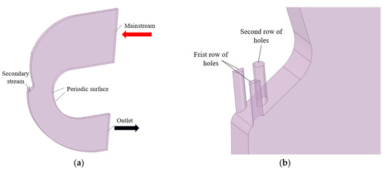6] numerically examined the arrangement and velocity-ratio effects of two rows of simple holes and compound-angle holes, finding that staggered arrangement at zero azimuth angle is preferable, while an in-line arrangement at a 30° azimuth angle performs best; for a velocity ratio of 2, the compound in-line configuration achieved the largest improvement (approximately 336.5%), whereas compound angles in staggered layouts reduced effectiveness, with the adverse effect becoming more pronounced at higher velocity ratios. Zhang et al. [