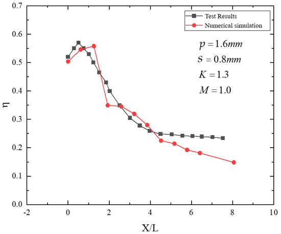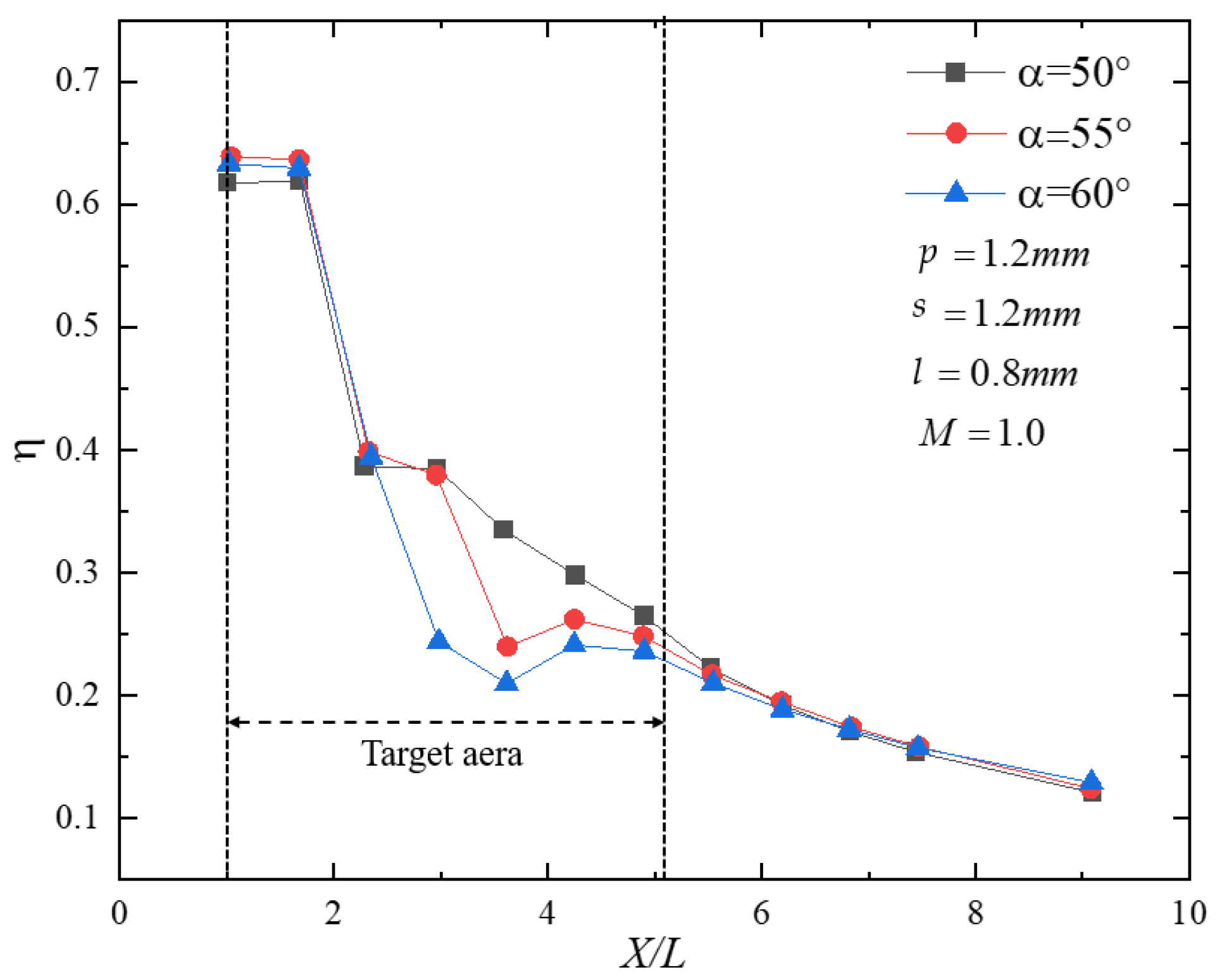 conditions. The adiabatic film-cooling effectiveness (η) exhibits a reversed trend with
