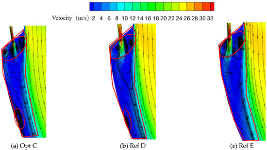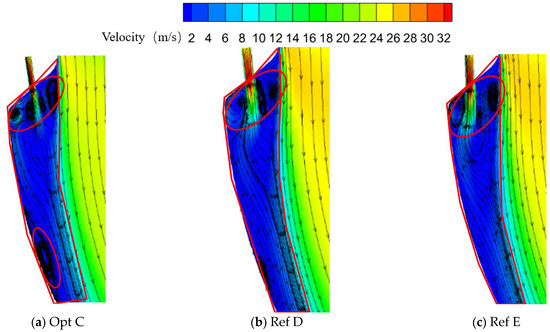 In the region between the second-row jet and the mainstream, all three configurations exhibit a pair of counter-rotating vortices. For Opt C, the vortex adjacent to the coolant side is smaller in size, whereas for Ref E, the corresponding vortex is larger. In all cases, the mainstream and coolant undergo mixing to some extent in this region.