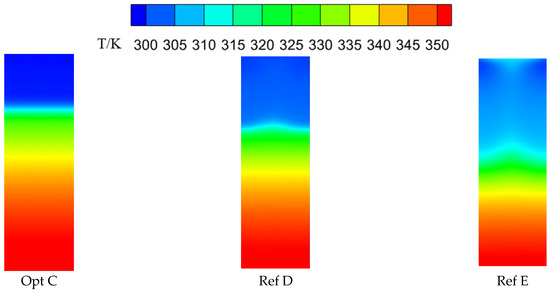 Figure 16 presents the downstream wall temperature fields for the globally optimal configuration Opt C and the reference configurations Ref D and Ref E. The three configurations exhibit noticeable differences in streamwise and spanwise cooling effectiveness, temperature gradients, and the extent of film coverage. Opt C shows a relatively large streamwise temperature gradient and a higher cooling effectiveness in the near-hole region, together with better spanwise uniformity of cooling effectiveness. However, its streamwise effectiveness decays more rapidly, resulting in a comparatively smaller film coverage area. By contrast, Ref D and Ref E yield lower effectiveness in the near-hole region and less uniform spanwise distributions, but their streamwise effectiveness decreases more gradually, leading to a slightly wider film coverage. Nevertheless, in terms of the area-averaged effectiveness over the target region, Opt C remains the highest, followed by Ref D, with Ref E being the lowest.