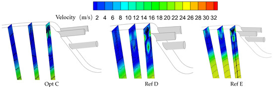 Figure 17 compares the flow fields for the globally optimal configuration Opt C and the reference configurations Ref D and Ref E, showing substantial differences among the three cases on these planes.