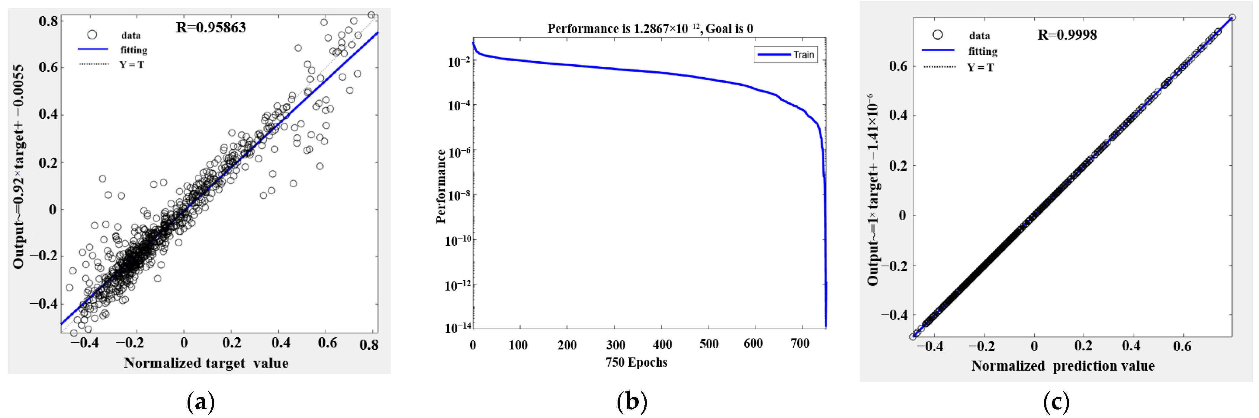 −12) and a correlation coefficient of (R = 0.9998 ≈ 1), indicating extremely high predictive accuracy.