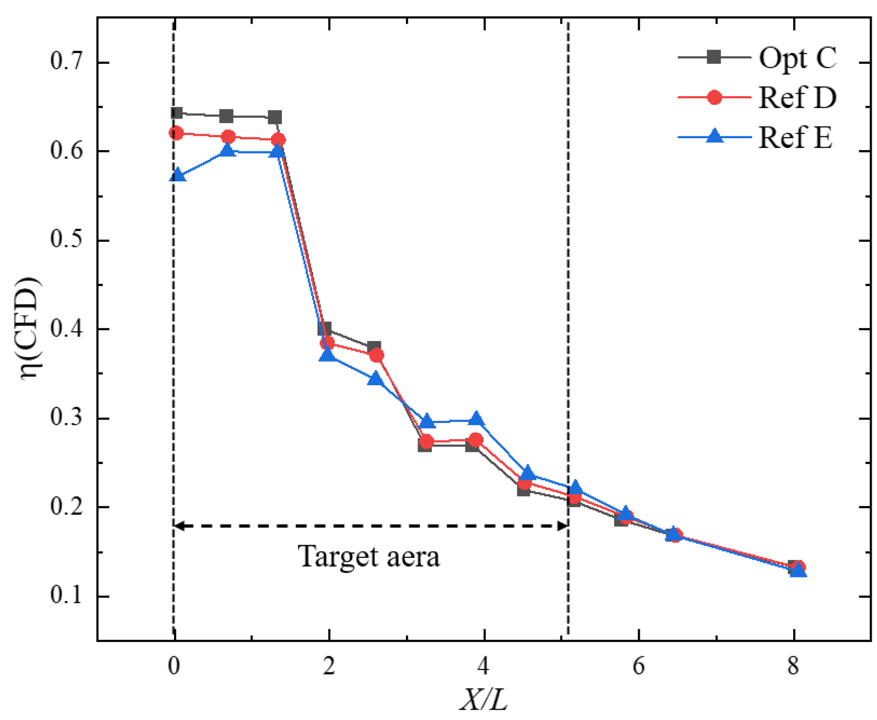Figure 13 shows the streamwise distributions of film-cooling effectiveness downstream of the holes for the globally optimal configuration Opt C and the reference configurations Ref D and Ref E. As can be observed, the largest differences among the three cases occur within the target region X/L = 0–5.2. For Opt C and Ref D, the effectiveness decreases slowly over X/L = 0–2.5, followed by a rapid decline over X/L = 2.5–5.2. In contrast, Ref E exhibits a slight increase in effectiveness in the near-hole region X/L = 0–0.64, after which it gradually decreases over X/L = 0.64–5.2. In terms of the area-averaged effectiveness over the target region, Opt C is the highest (