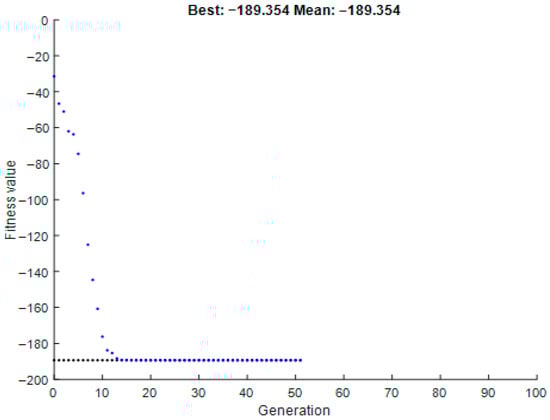 The GA converged after 50 generations, with the best fitness value stabilizing at −189.35 Hz, representing a minimum frequency separation of 189.35 Hz from the excitation range. The mean fitness improved from −46.63 Hz (Generation 1) to −189.35 Hz (Generation 50), indicating consistent progress toward optimality. Stall generations (no improvement) occurred after Generation 20, indicating that the solution had approached a global optimum.