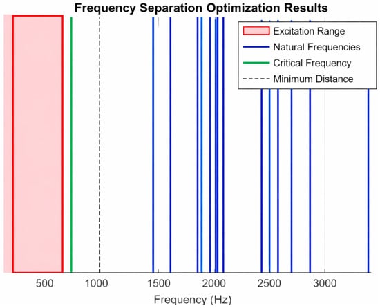 The GA optimization is validated against the system’s excitation range (72–336 Hz), with no natural frequencies occurring below the lower bound of 261.35 Hz (72 + 189.35 Hz) and the upper bound of 336 Hz, which is far above the first optimized natural frequency (≥261.35 Hz).