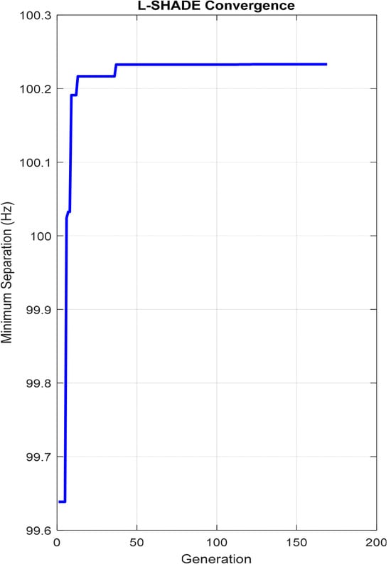 On its part, L-SHADE optimization achieved a minimum frequency separation of 100.23 Hz, as shown in Figure 8.