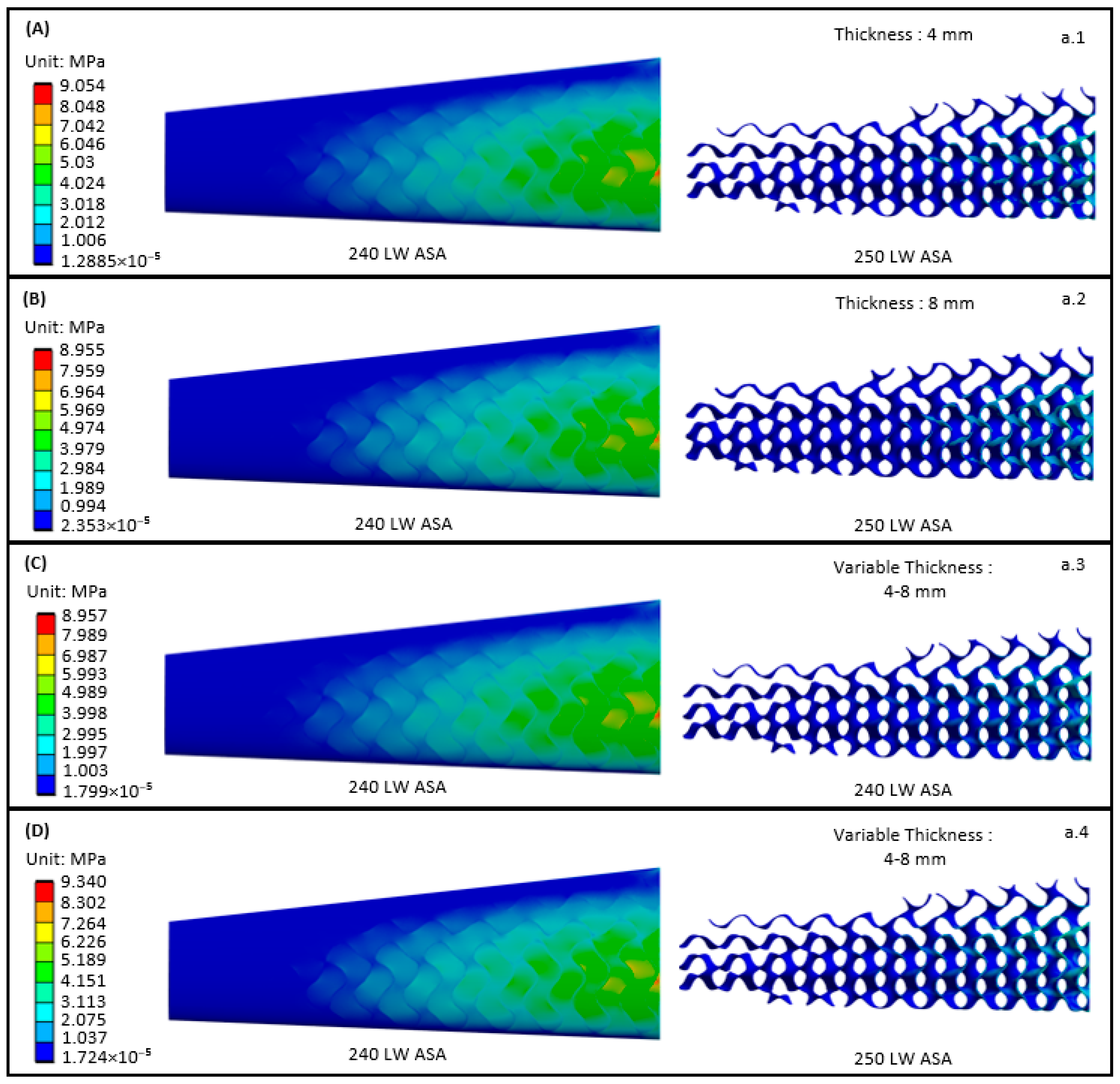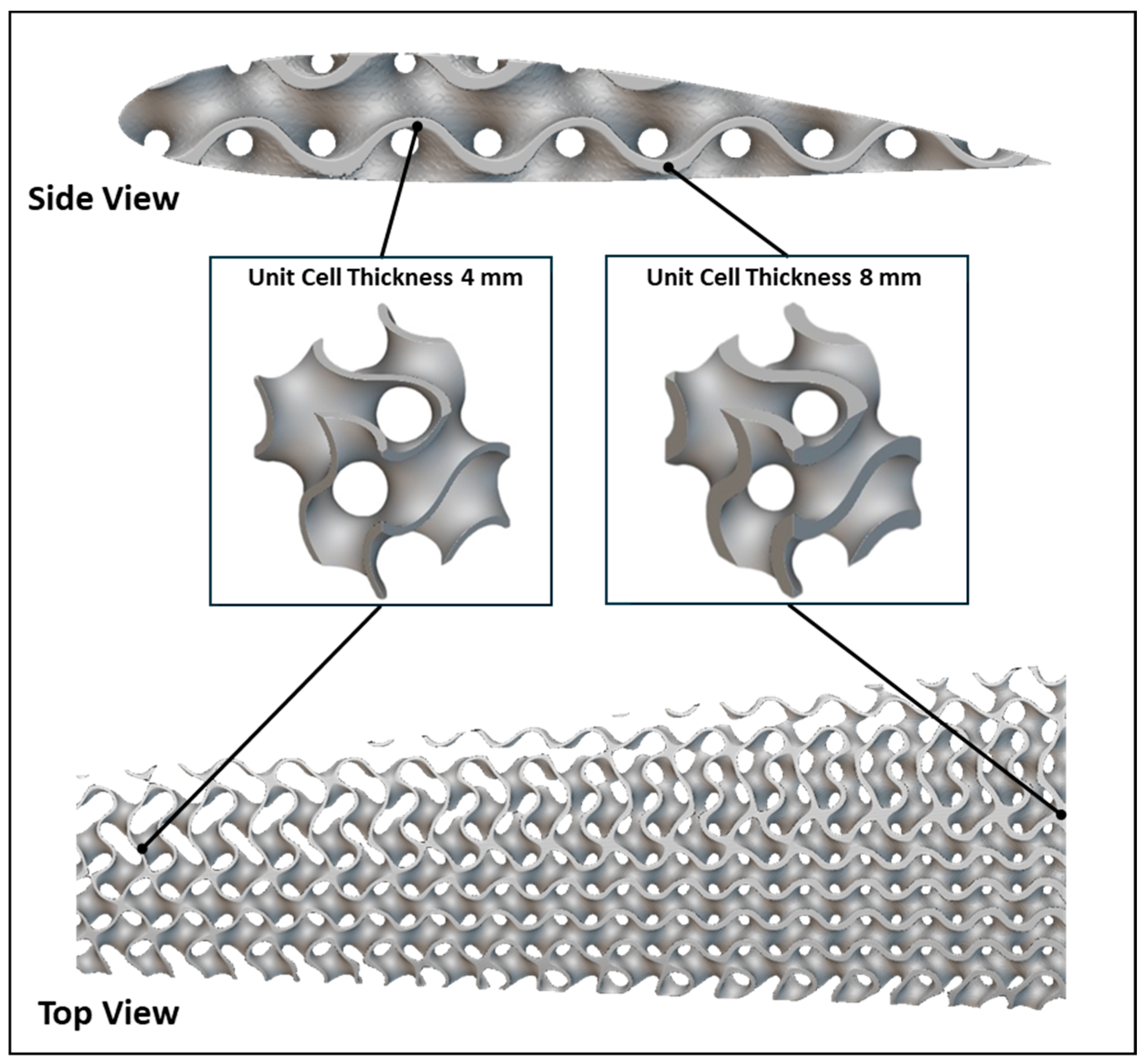 | Case Study | TPMS Thickness (mm) | TPMS Printing Temperature (°C) | TPMS Weight (g) | Shell Thickness (mm) | Shell Printing Temperature (°C) | Shell Weight (g) |