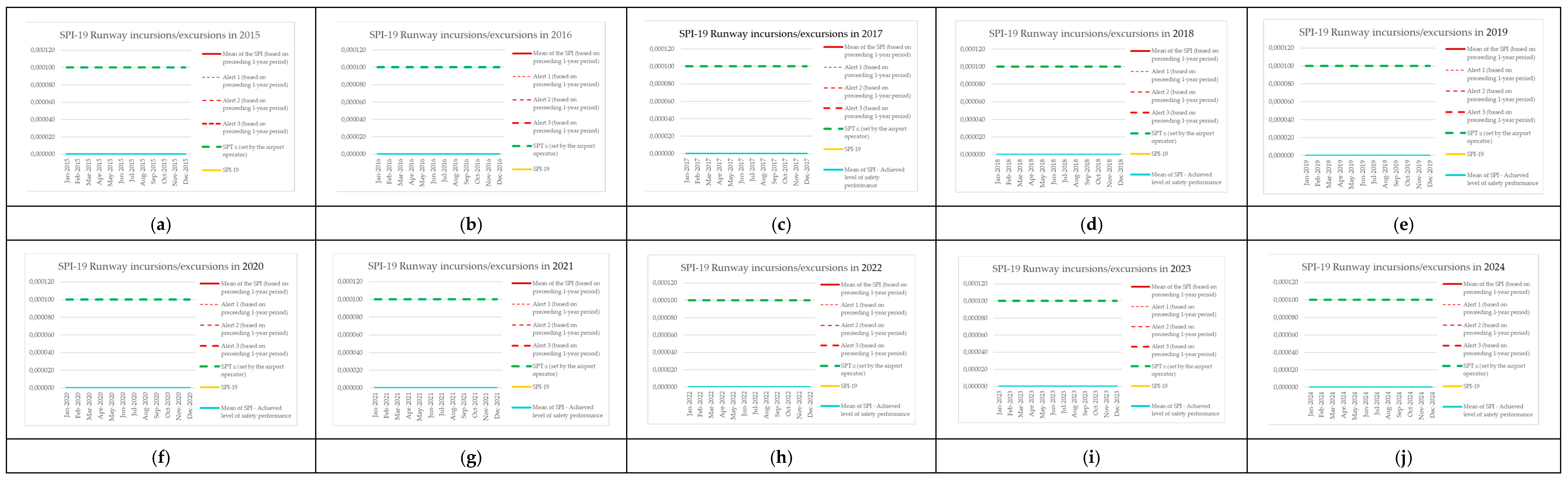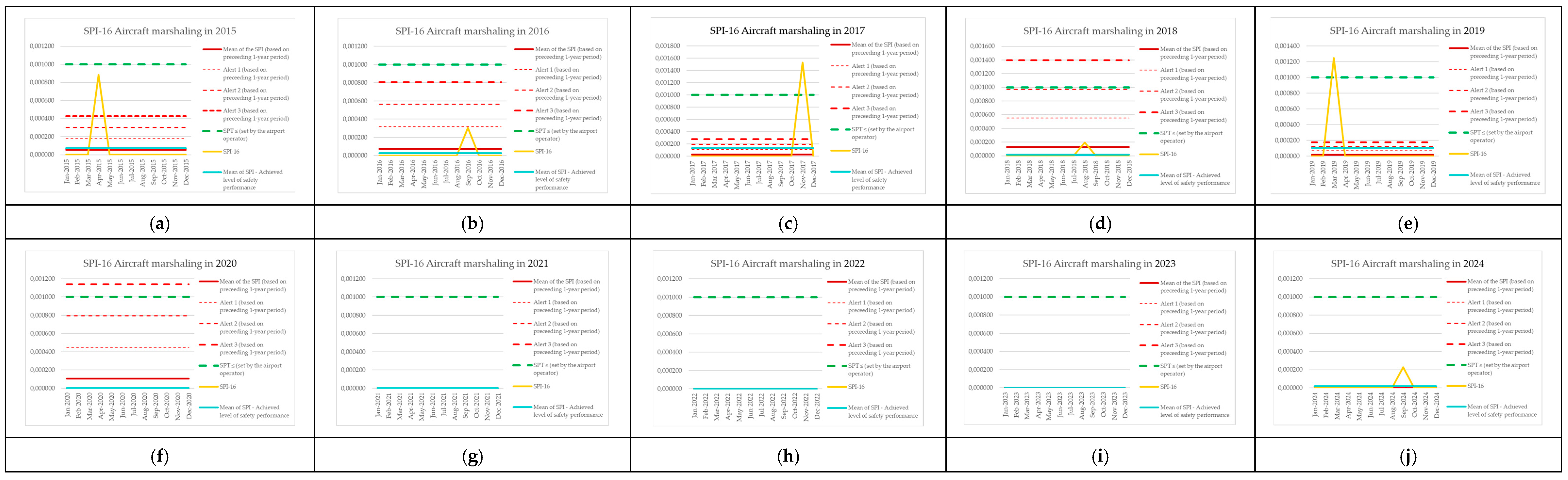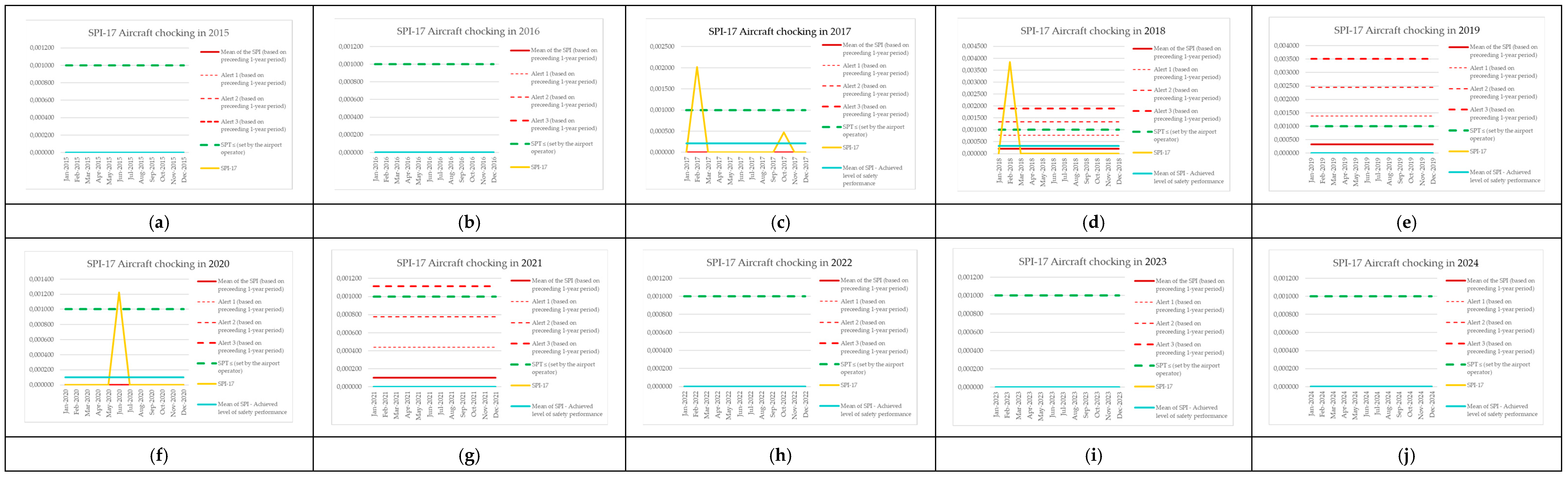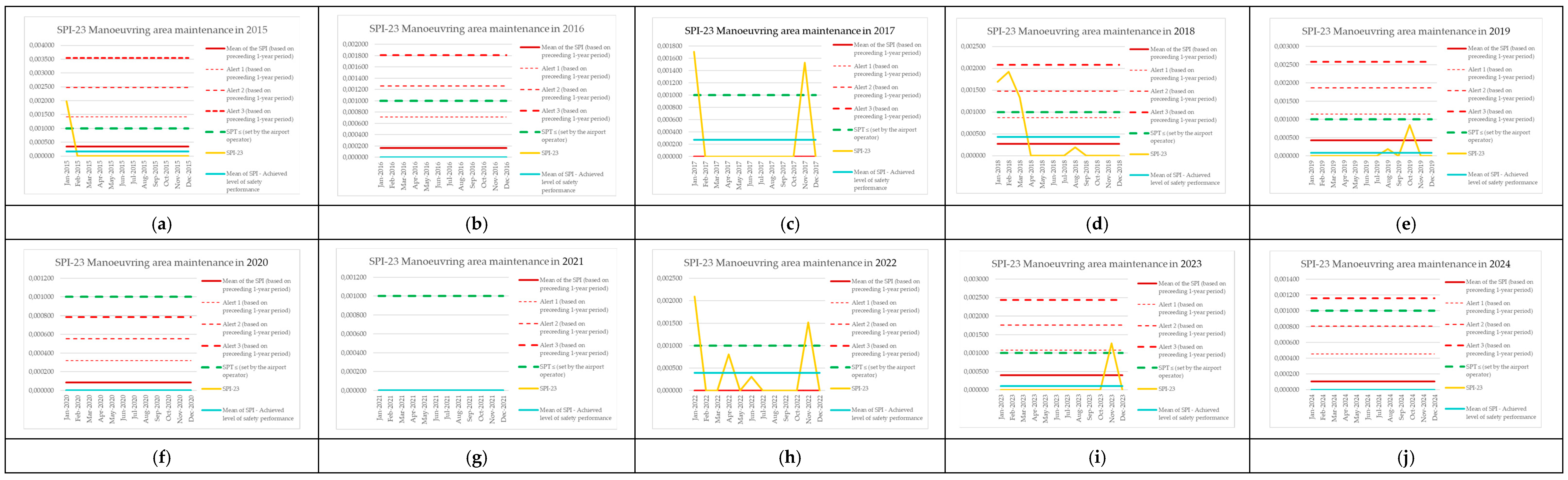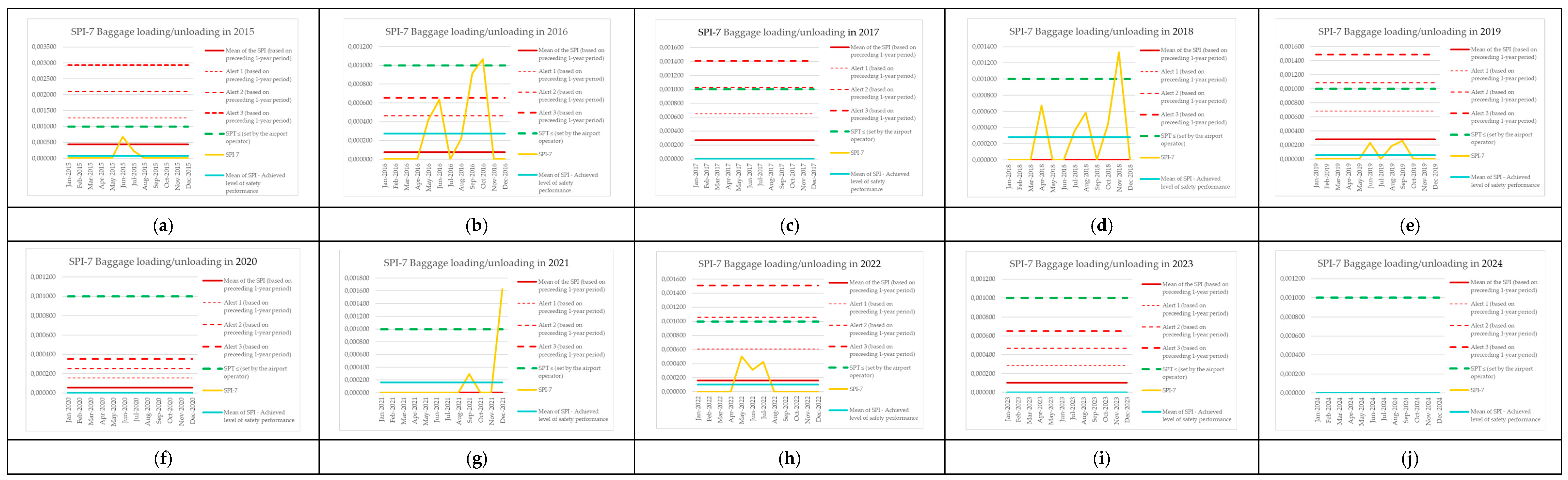 | Monitoring Period | Number of Aircraft Operations | Number of Events (SPI-8) | SPI-8 (Preceding 1-Year Period) | Mean of the SPI (Based on Preceding 1-Year Period) | Alert 1 (Based on Preceding 1-Year Period) | Alert 2 (Based on Preceding 1-Year Period) | Alert 3 (Based on Preceding 1-Year Period) | SPT ≤ (Set by the Airport Operator) | SPI-8 [Events per Operations] | Mean of SPI—Achieved Level of Safety Performance |