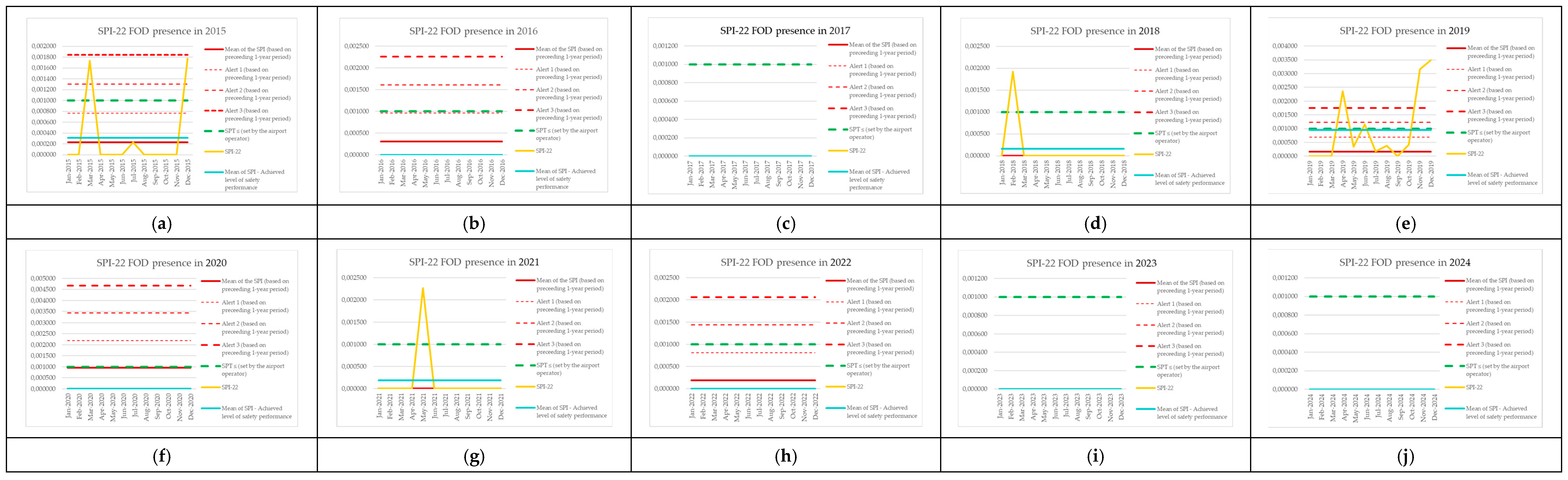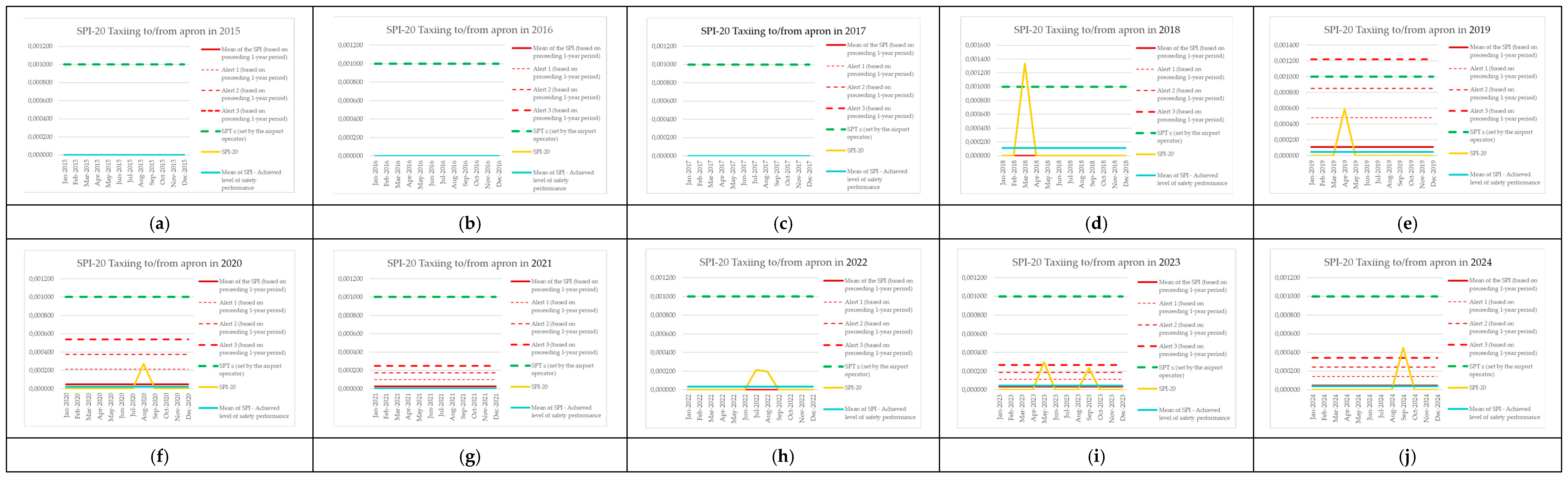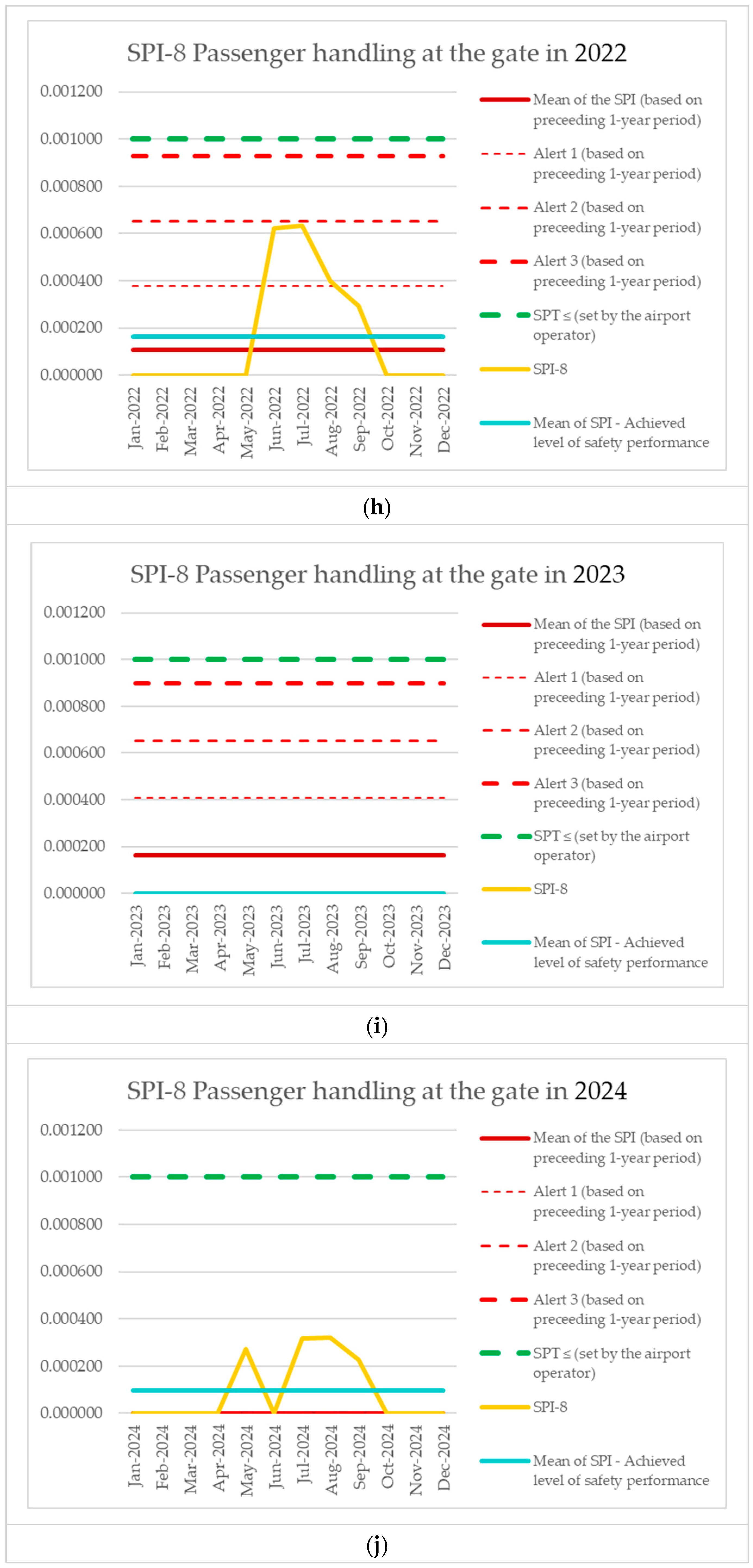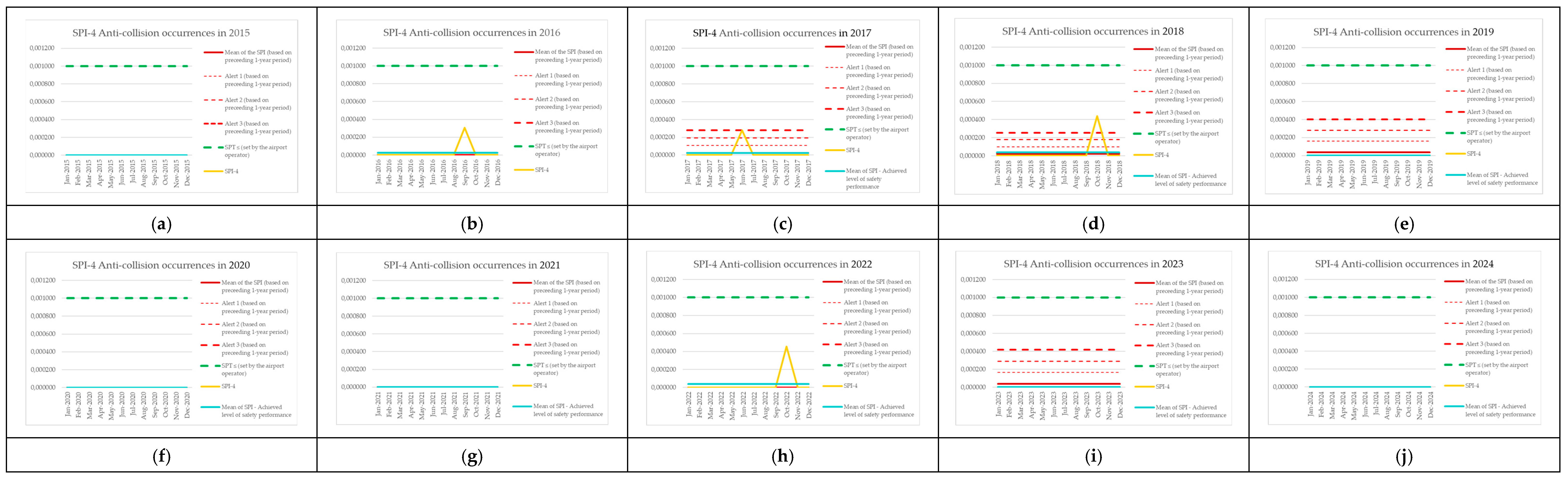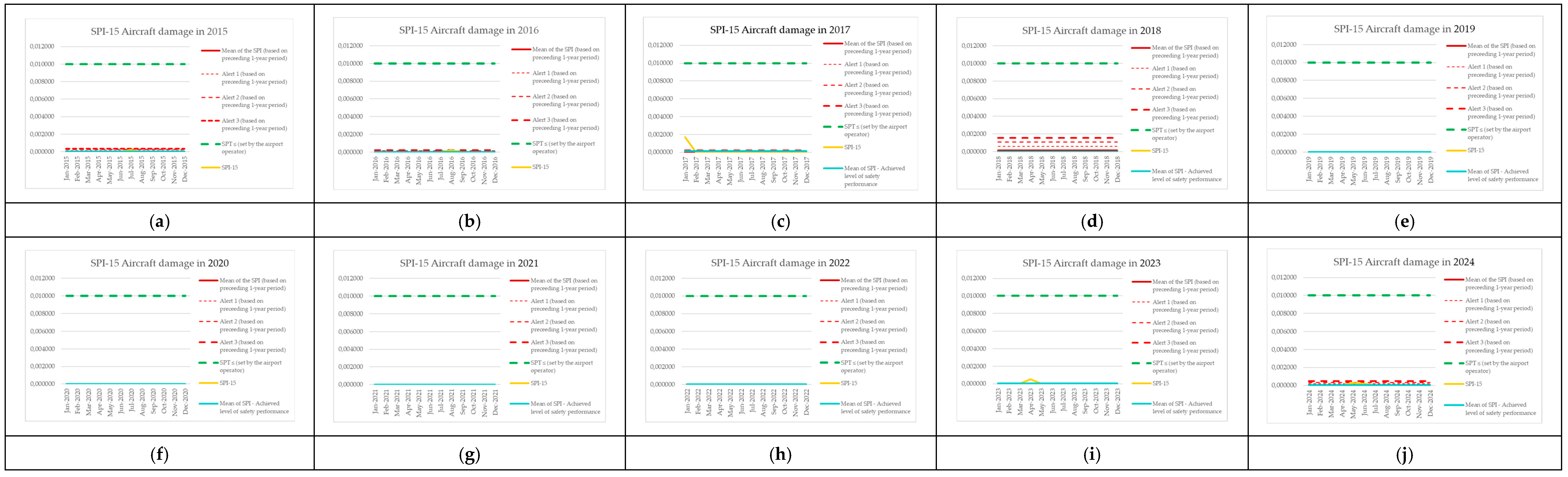 | Monitoring Period | Number of Aircraft Operations | Number of Events (SPI-8) | SPI-8 (Preceding 1-Year Period) | Mean of the SPI (Based on Preceding 1-Year Period) | Alert 1 (Based on Preceding 1-Year Period) | Alert 2 (Based on Preceding 1-Year Period) | Alert 3 (Based on Preceding 1-Year Period) | SPT ≤ (Set by the Airport Operator) | SPI-8 [Events per Operations] | Mean of SPI—Achieved Level of Safety Performance |