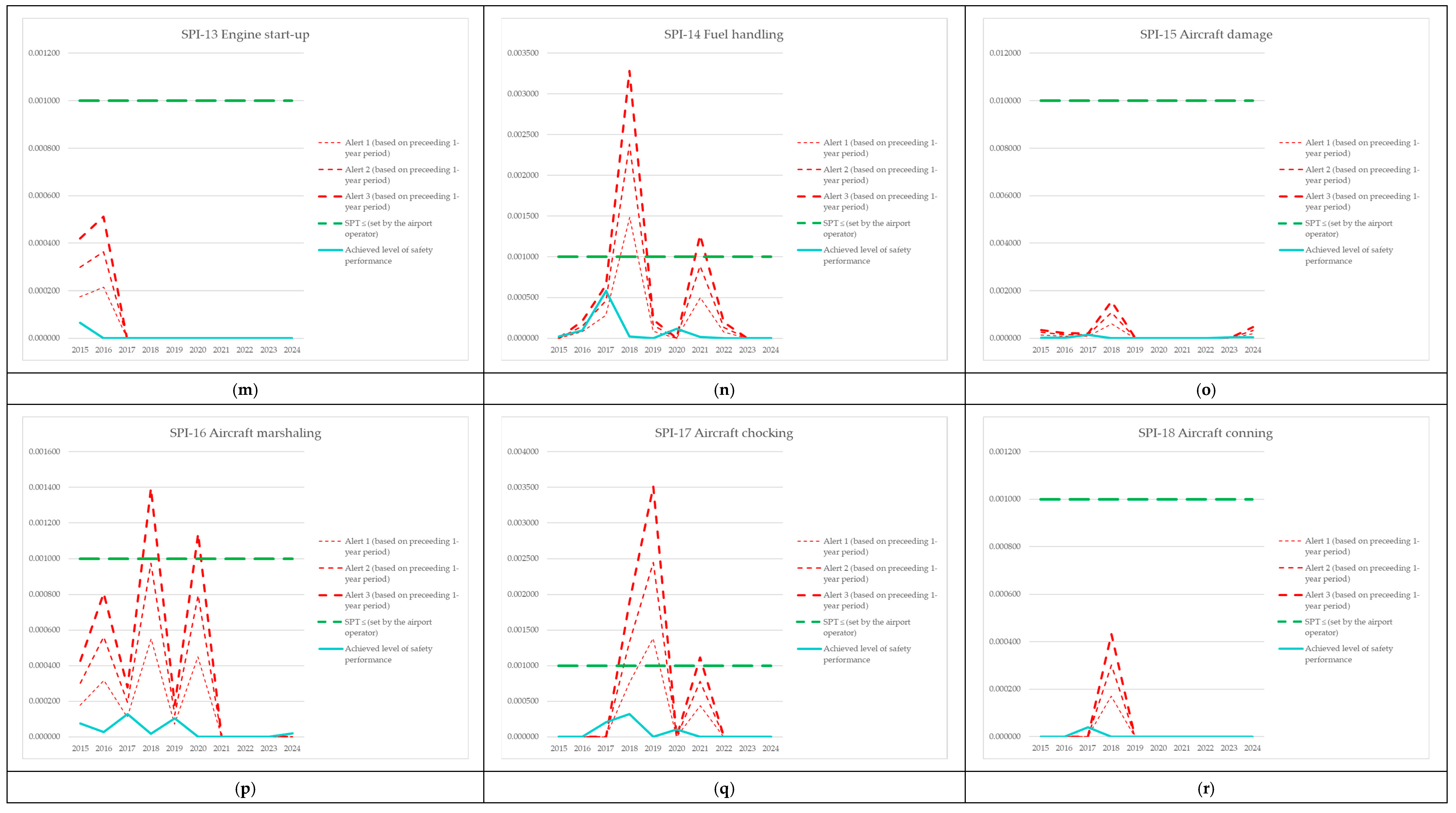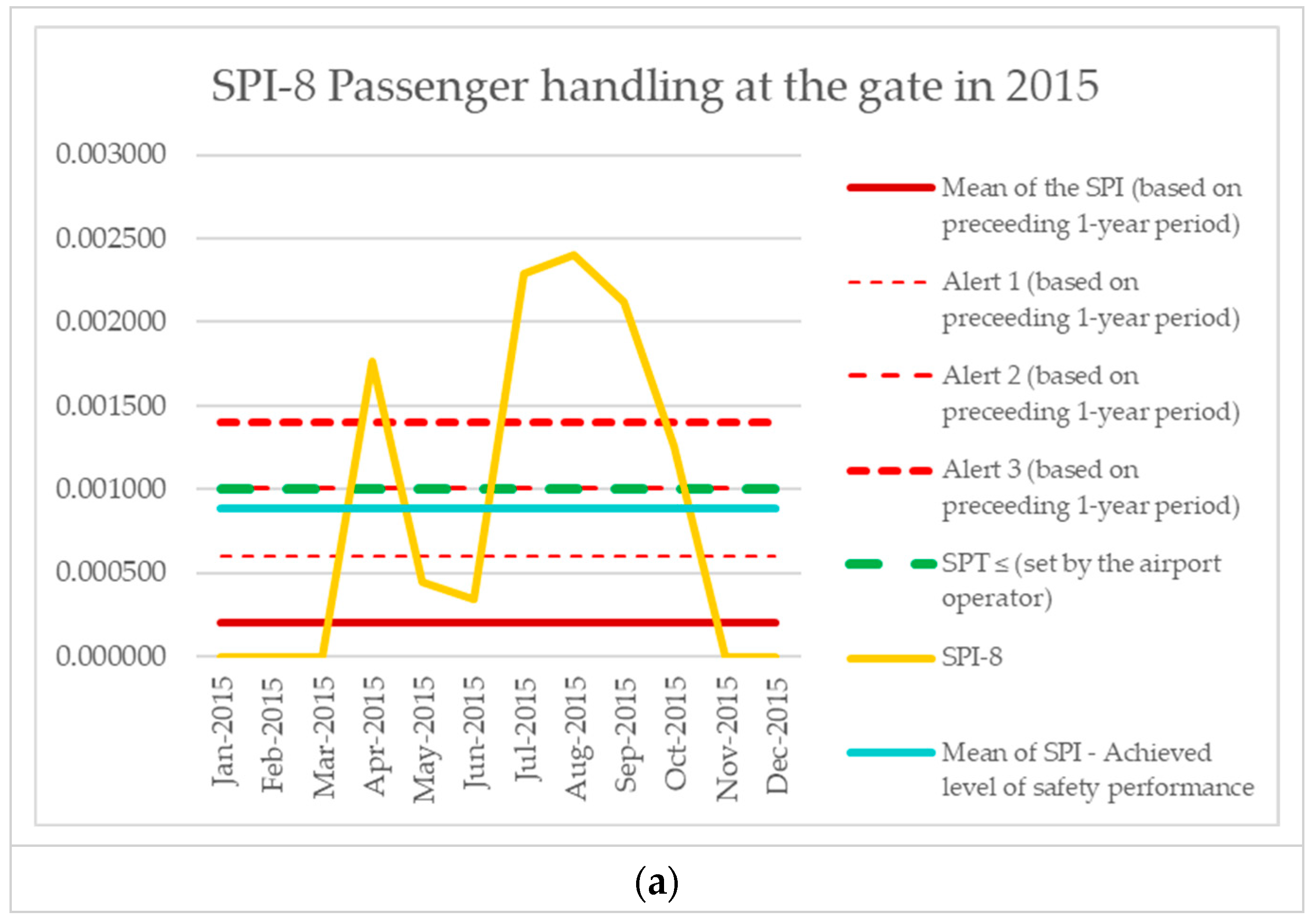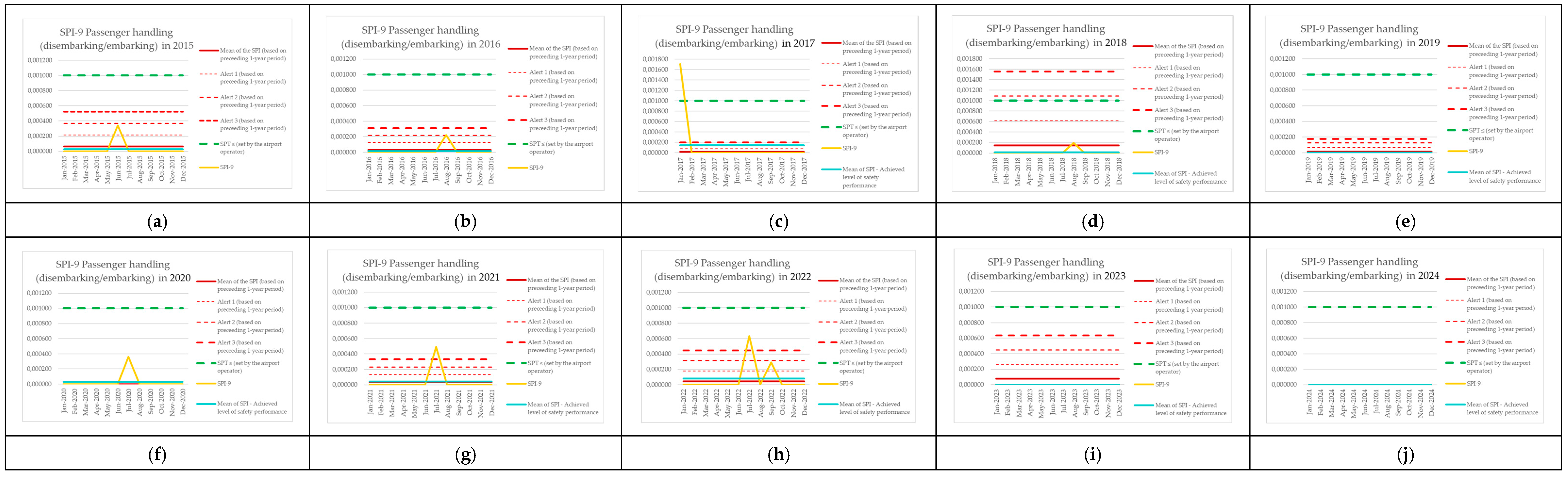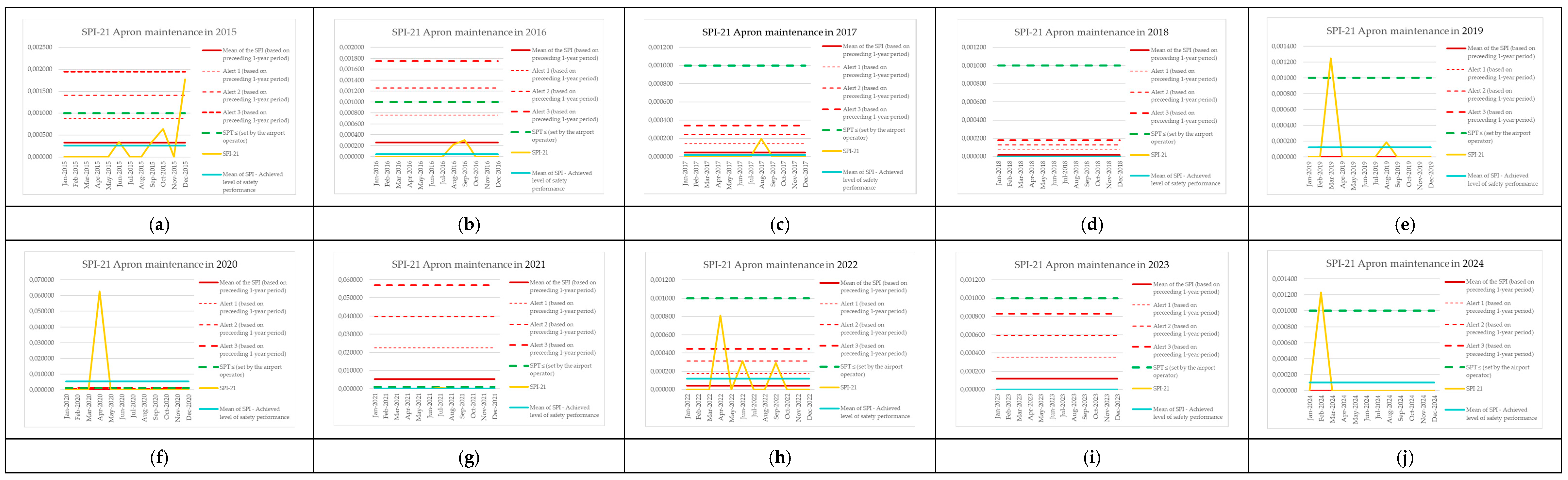 | Monitoring Period | Number of Aircraft Operations | Number of Events (SPI-8) | SPI-8 (Preceding 1-Year Period) | Mean of the SPI (Based on Preceding 1-Year Period) | Alert 1 (Based on Preceding 1-Year Period) | Alert 2 (Based on Preceding 1-Year Period) | Alert 3 (Based on Preceding 1-Year Period) | SPT ≤ (Set by the Airport Operator) | SPI-8 [Events per Operations] | Mean of SPI—Achieved Level of Safety Performance |