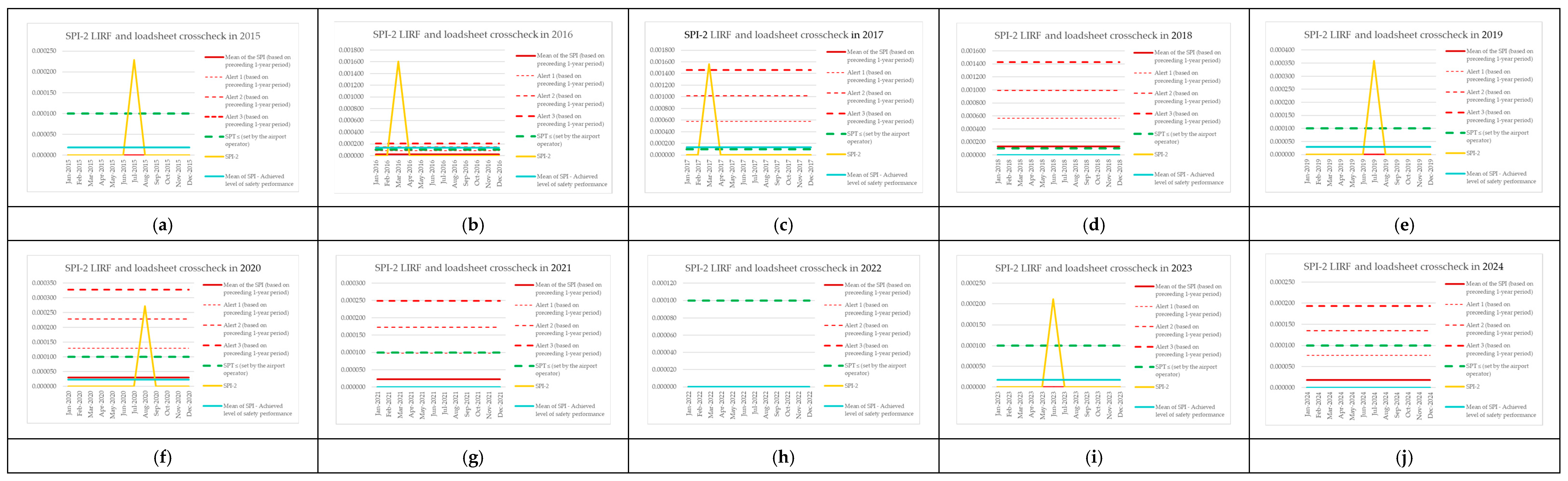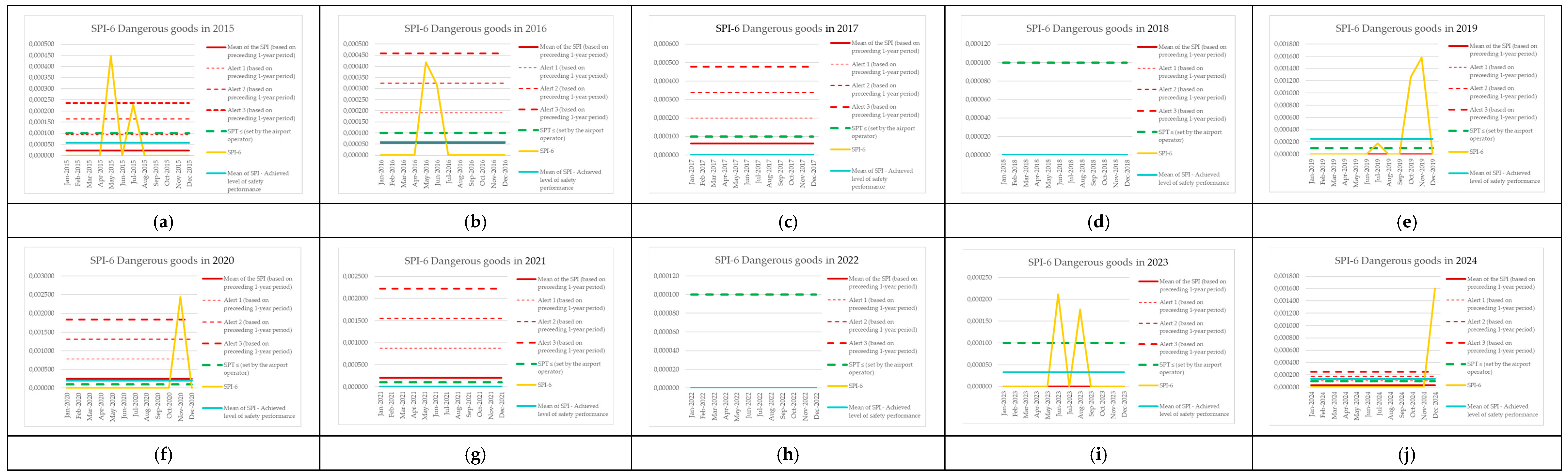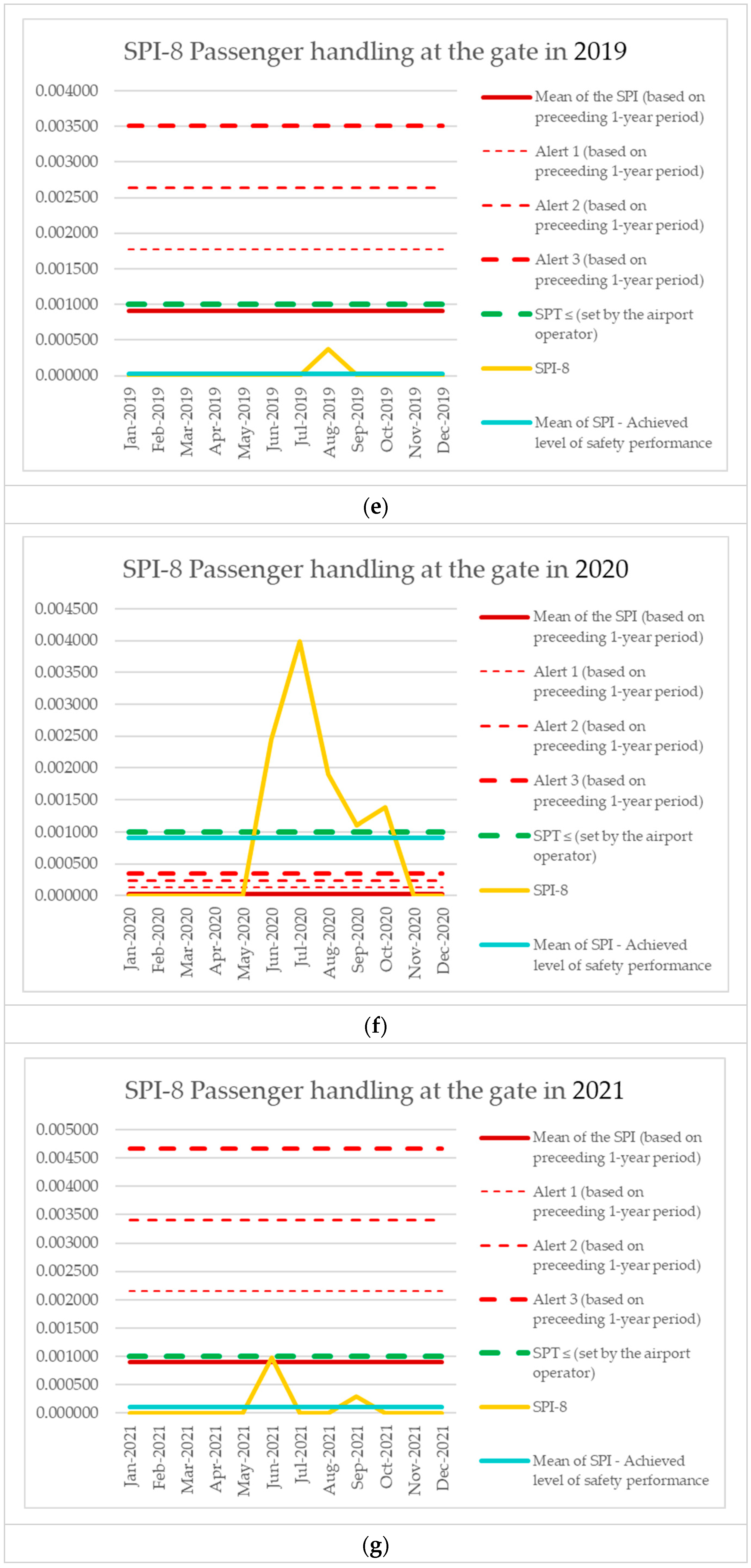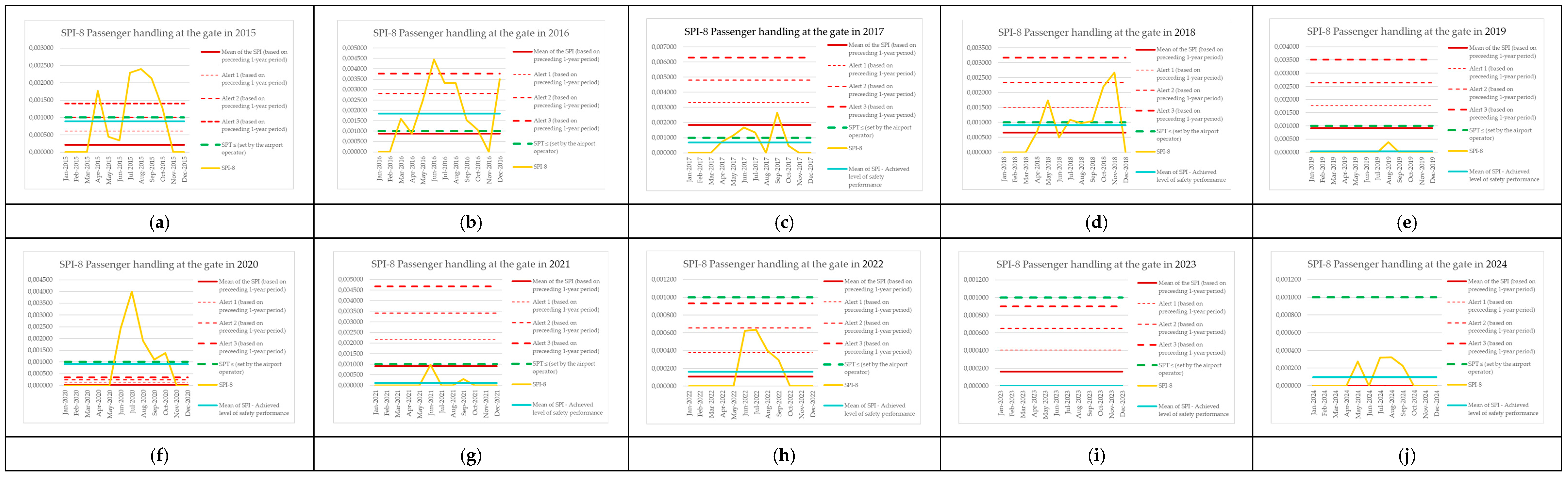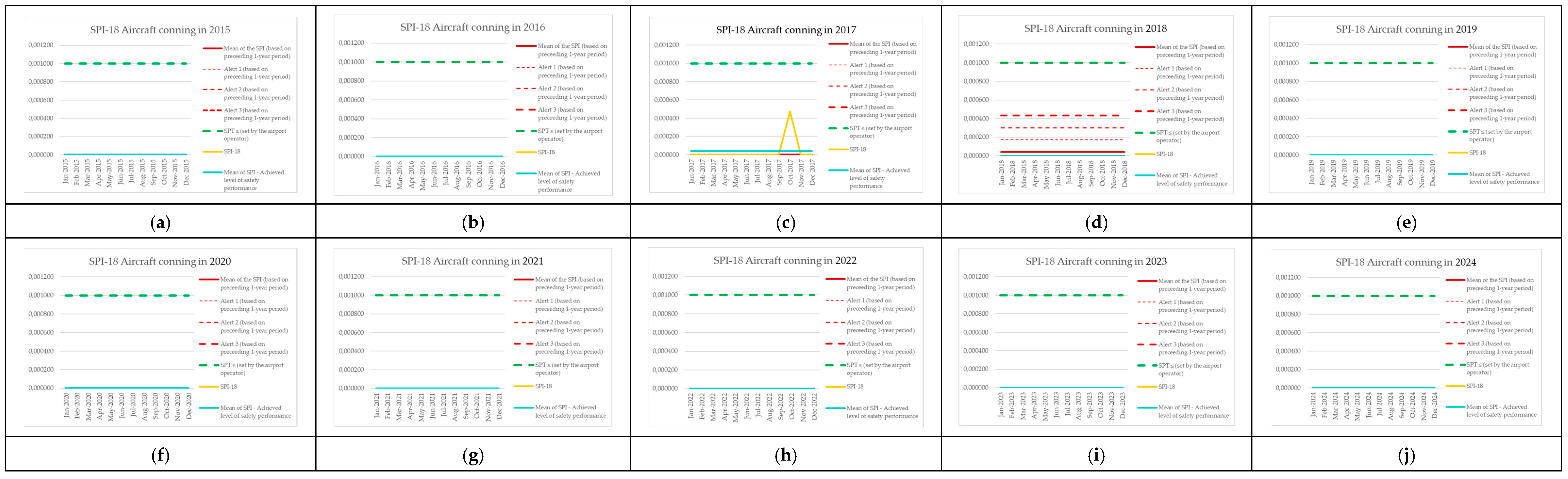 | Monitoring Period | Number of Aircraft Operations | Number of Events (SPI-8) | SPI-8 (Preceding 1-Year Period) | Mean of the SPI (Based on Preceding 1-Year Period) | Alert 1 (Based on Preceding 1-Year Period) | Alert 2 (Based on Preceding 1-Year Period) | Alert 3 (Based on Preceding 1-Year Period) | SPT ≤ (Set by the Airport Operator) | SPI-8 [Events per Operations] | Mean of SPI—Achieved Level of Safety Performance |