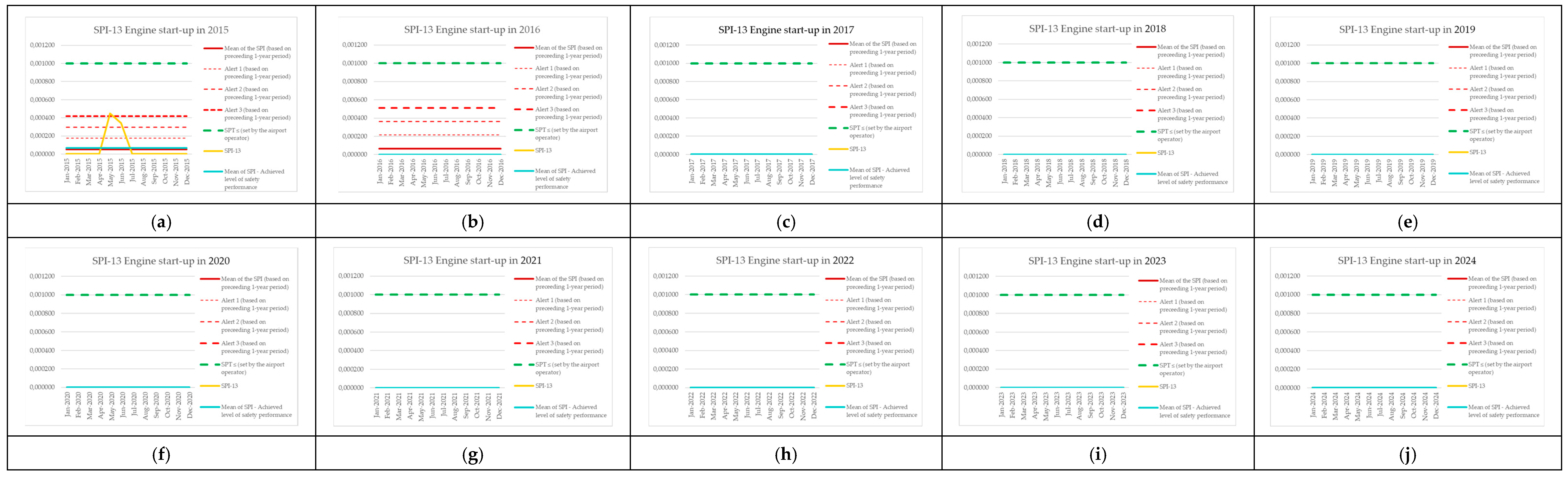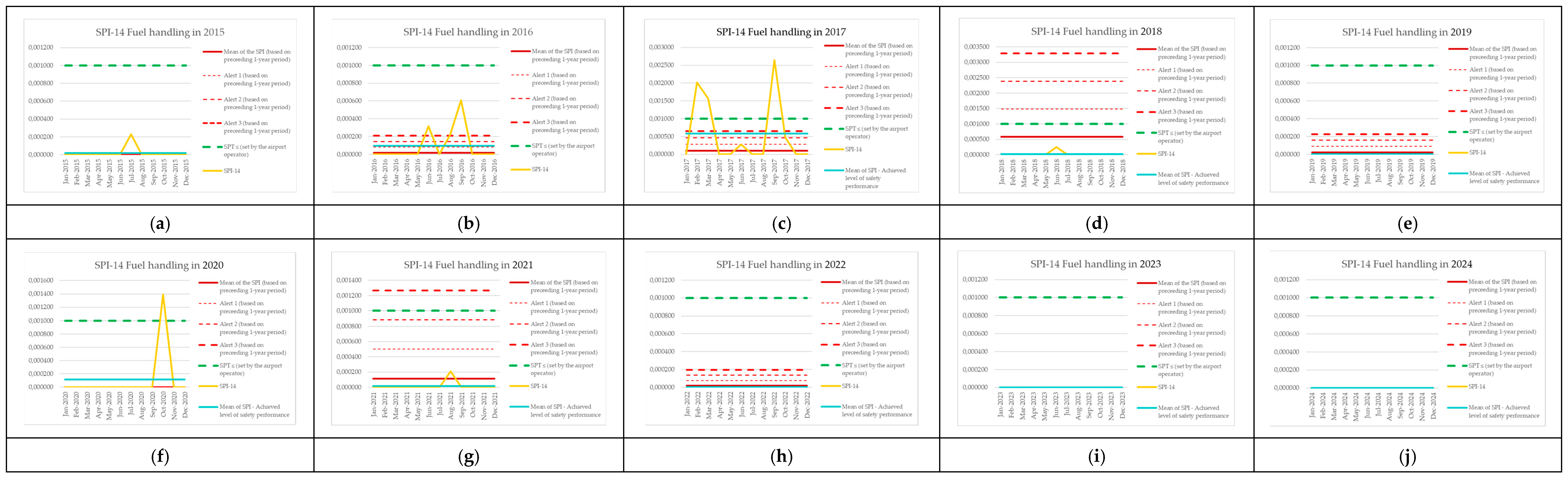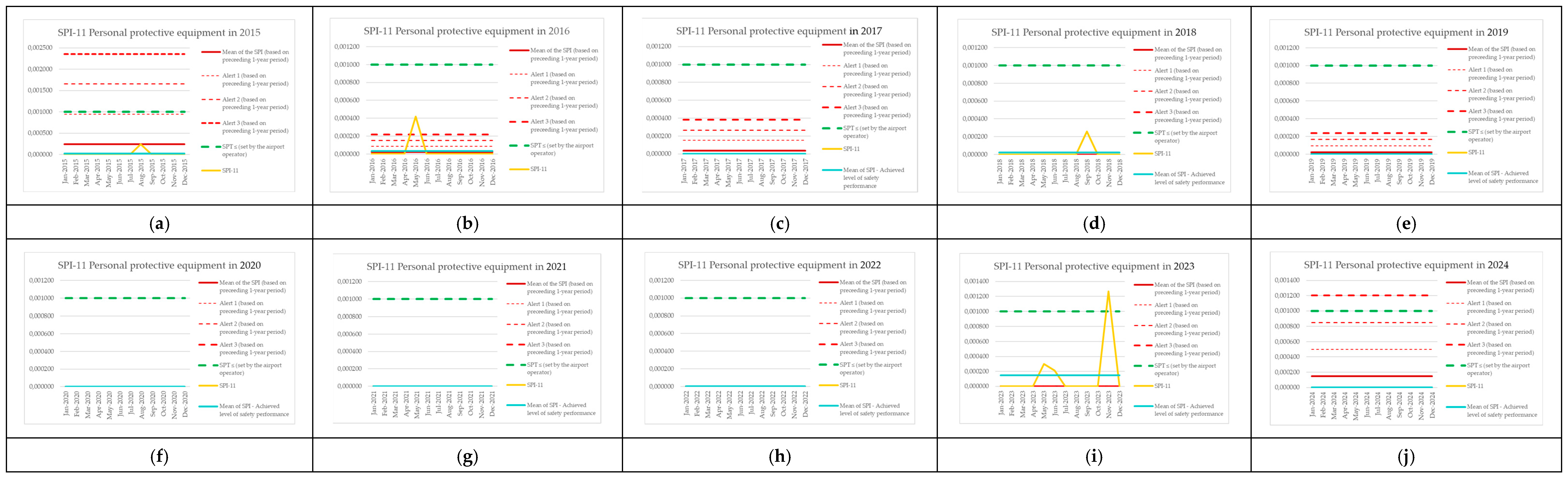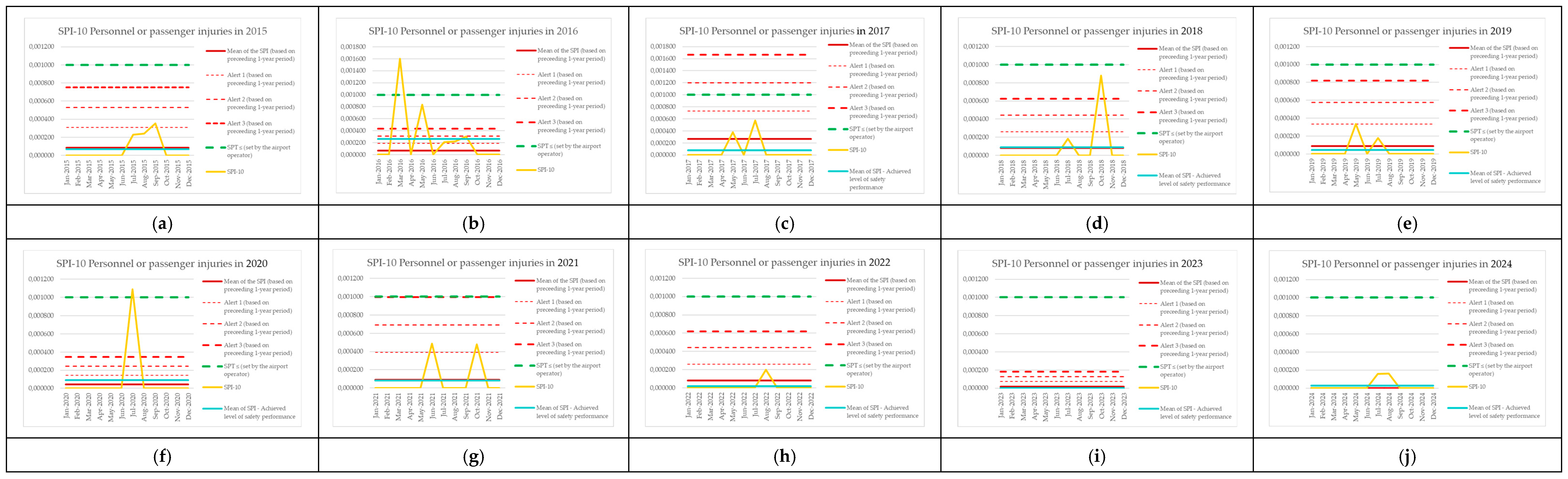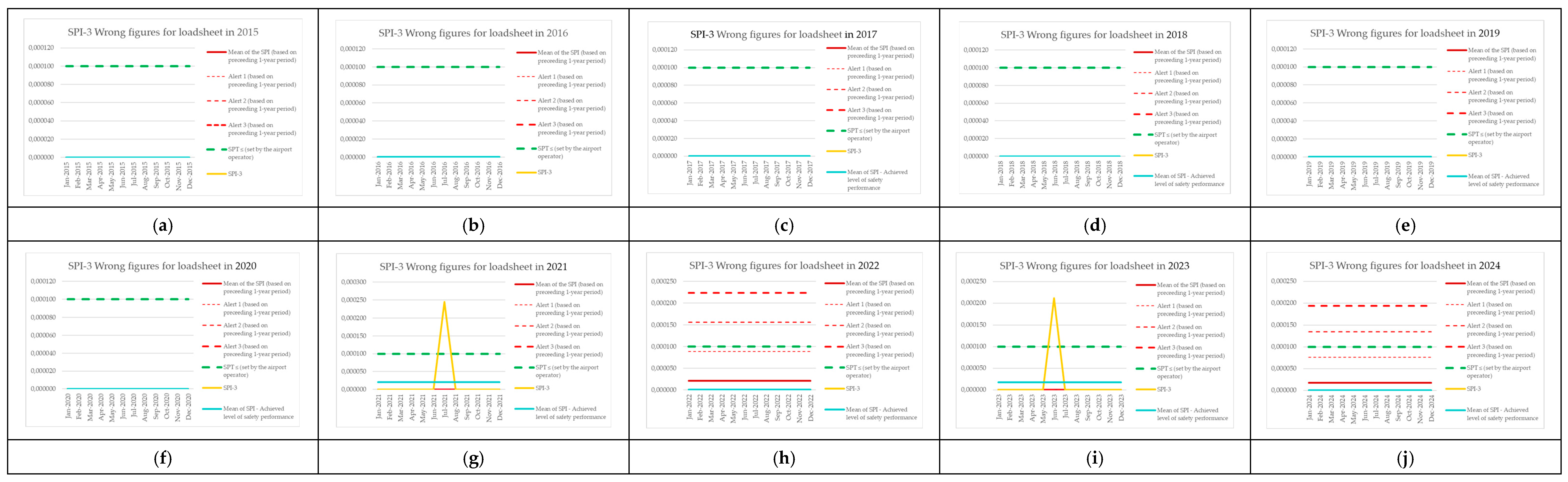 | Monitoring Period | Number of Aircraft Operations | Number of Events (SPI-8) | SPI-8 (Preceding 1-Year Period) | Mean of the SPI (Based on Preceding 1-Year Period) | Alert 1 (Based on Preceding 1-Year Period) | Alert 2 (Based on Preceding 1-Year Period) | Alert 3 (Based on Preceding 1-Year Period) | SPT ≤ (Set by the Airport Operator) | SPI-8 [Events per Operations] | Mean of SPI—Achieved Level of Safety Performance |