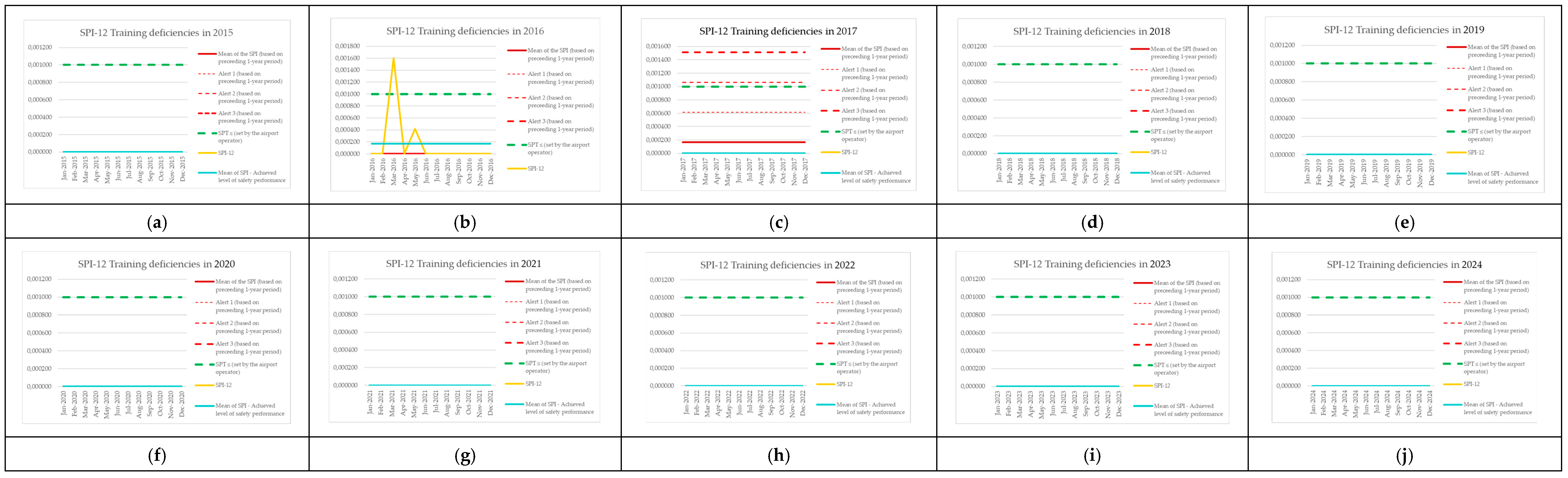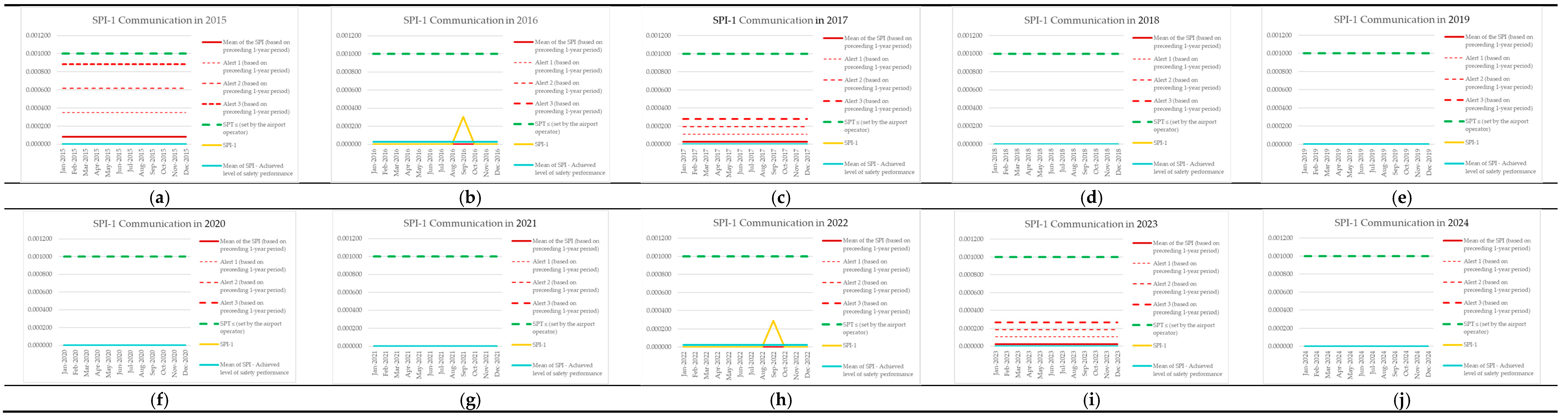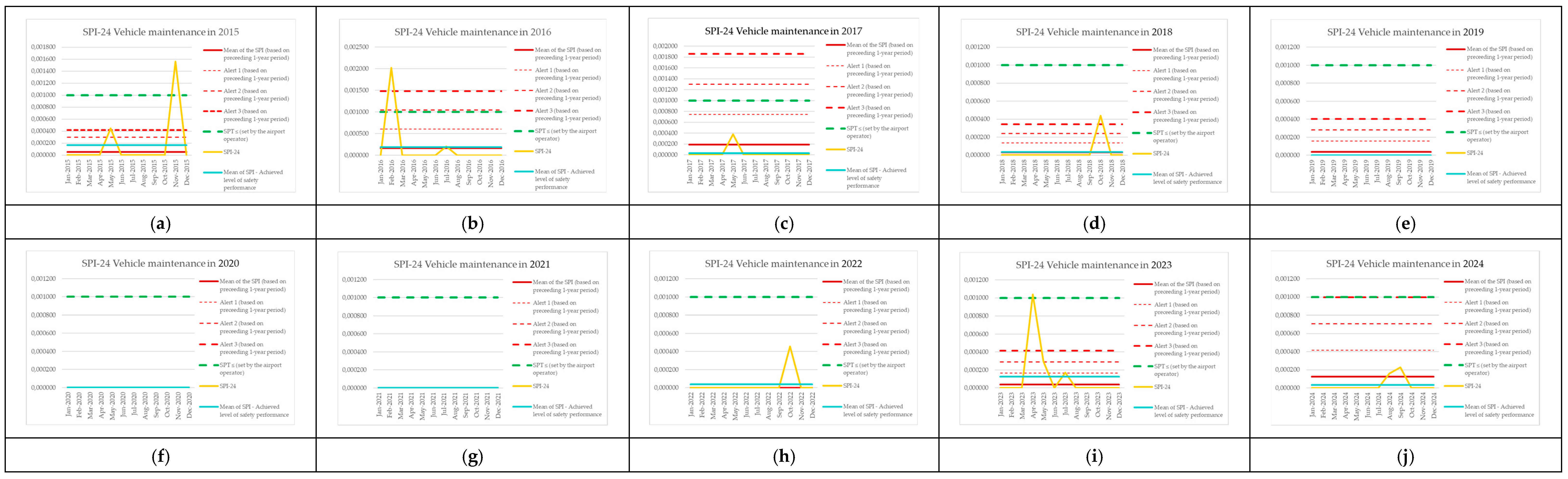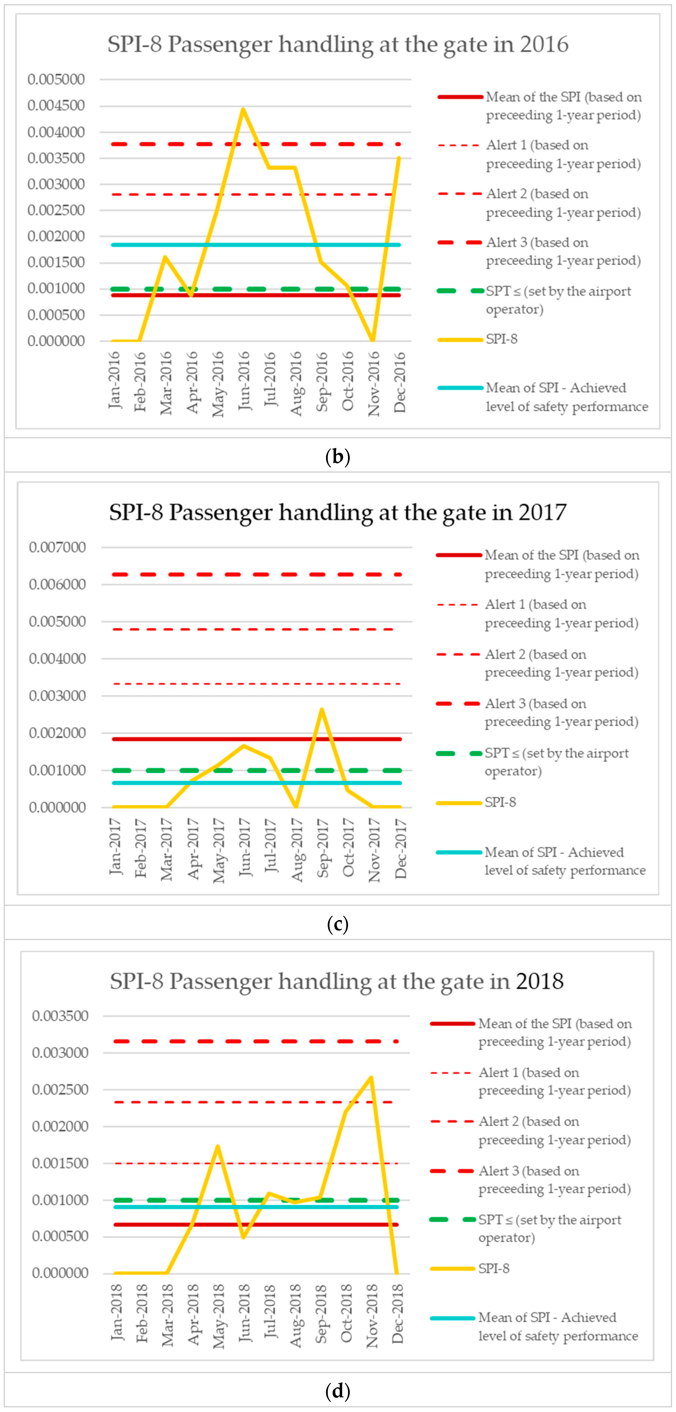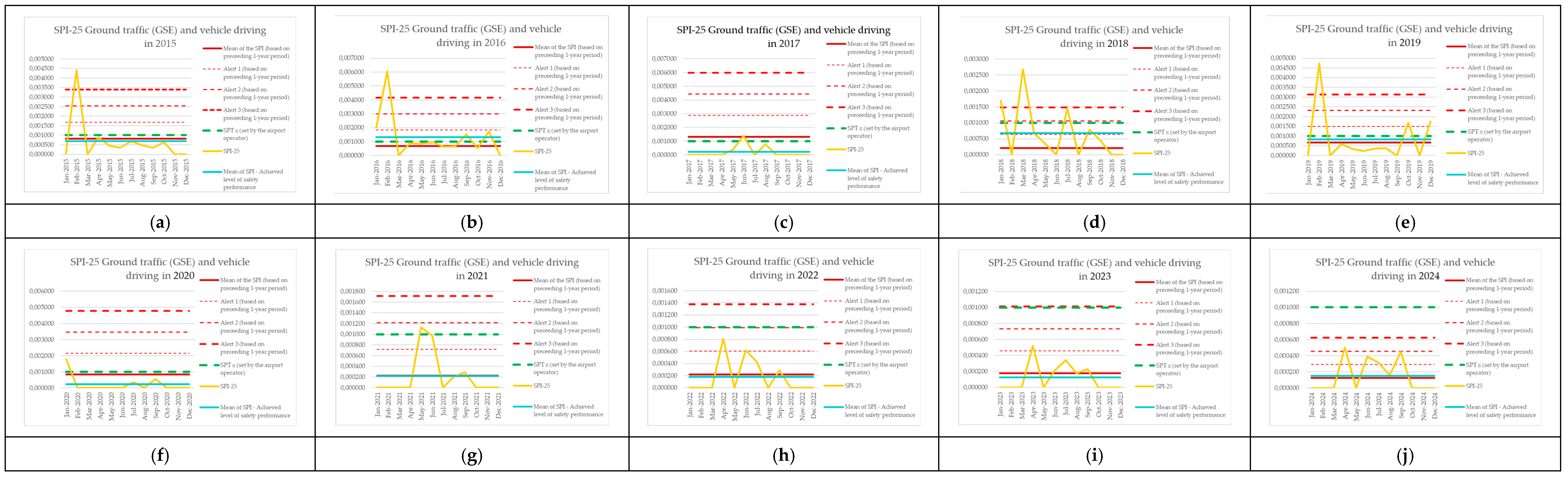 | Monitoring Period | Number of Aircraft Operations | Number of Events (SPI-8) | SPI-8 (Preceding 1-Year Period) | Mean of the SPI (Based on Preceding 1-Year Period) | Alert 1 (Based on Preceding 1-Year Period) | Alert 2 (Based on Preceding 1-Year Period) | Alert 3 (Based on Preceding 1-Year Period) | SPT ≤ (Set by the Airport Operator) | SPI-8 [Events per Operations] | Mean of SPI—Achieved Level of Safety Performance |