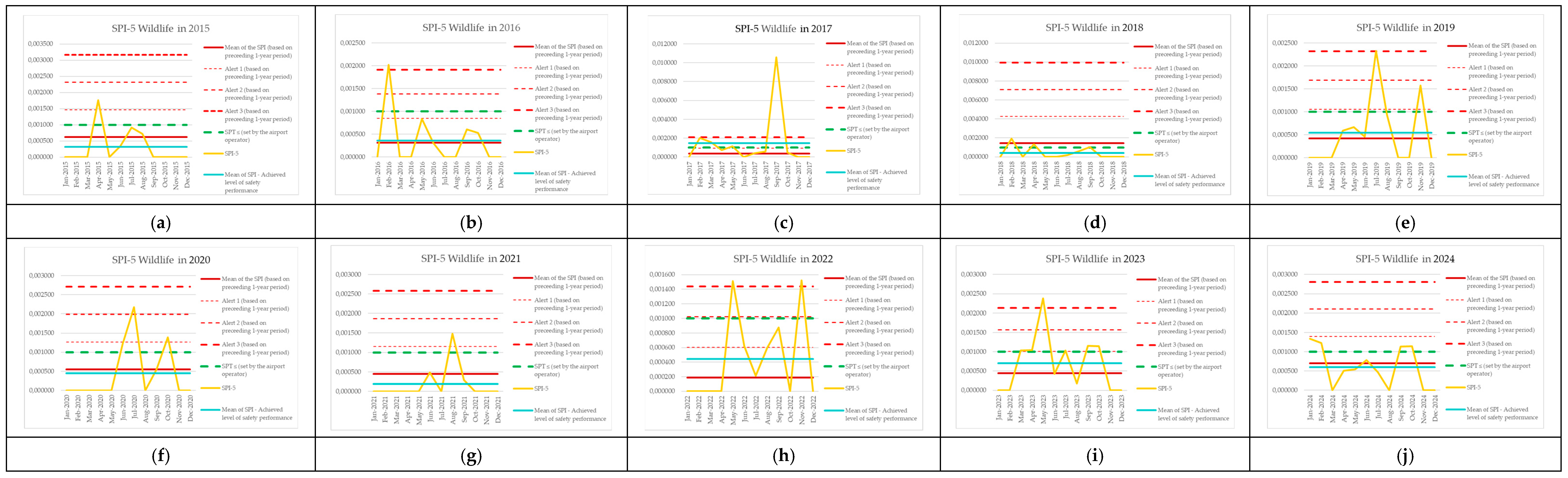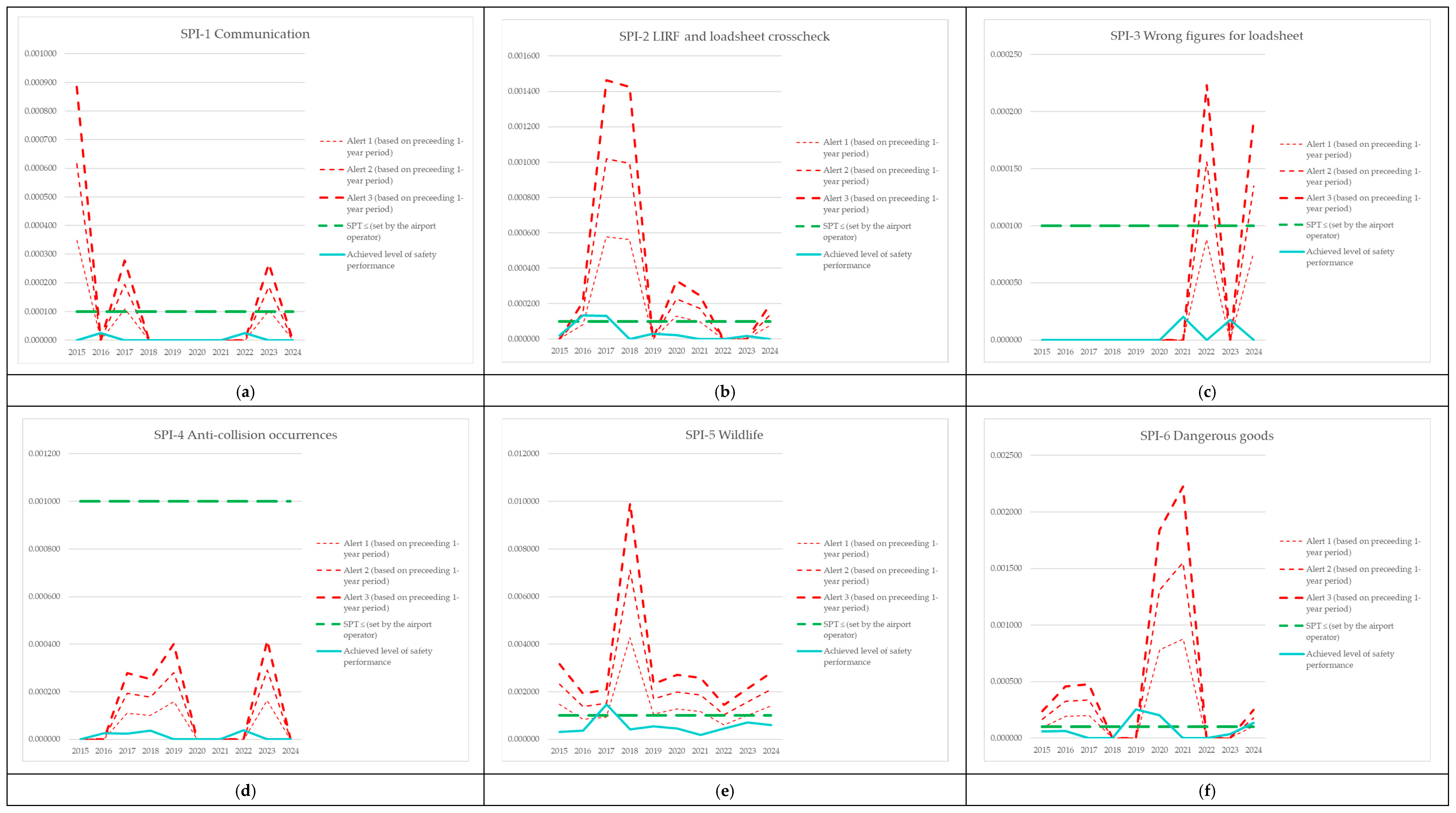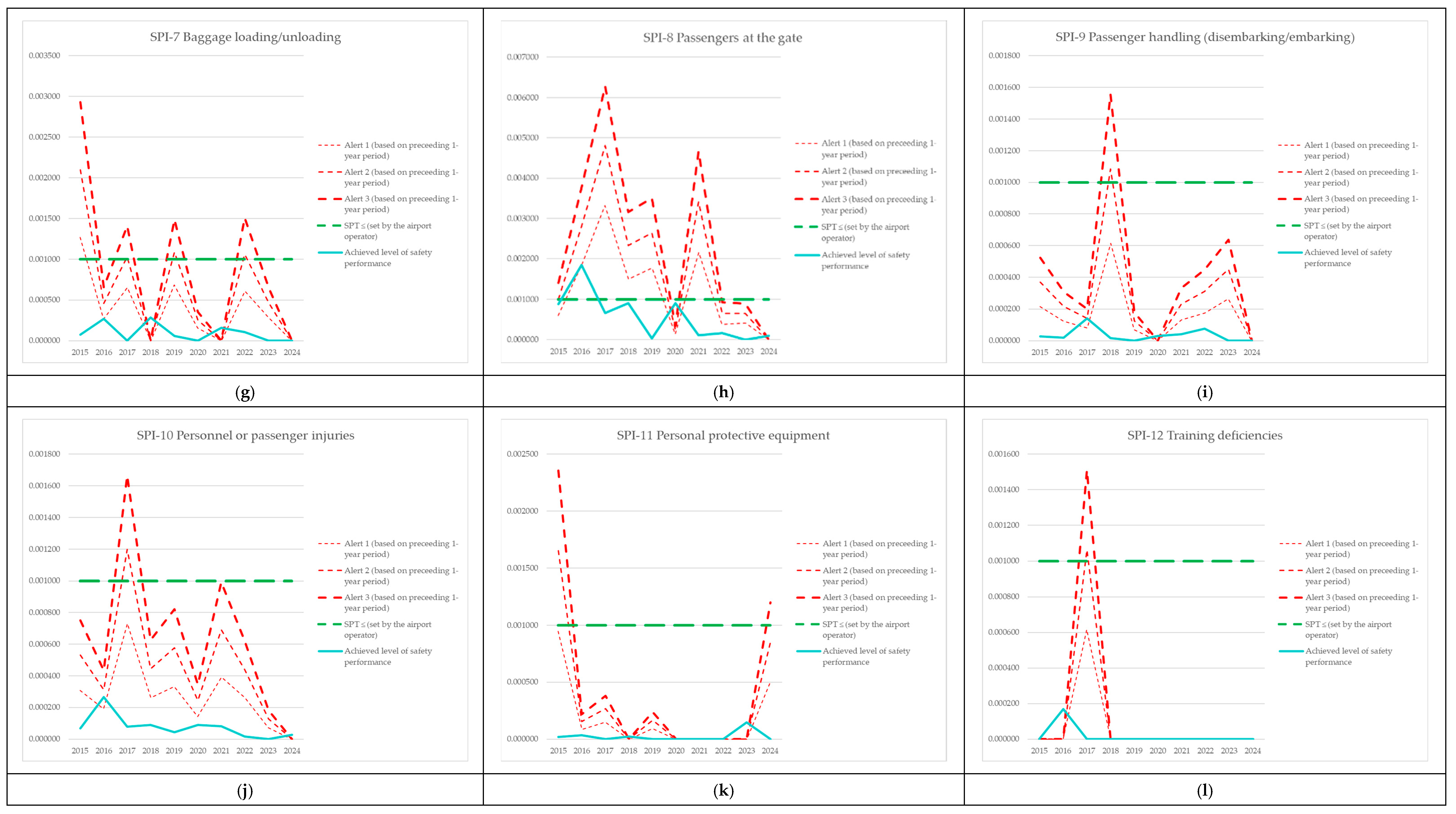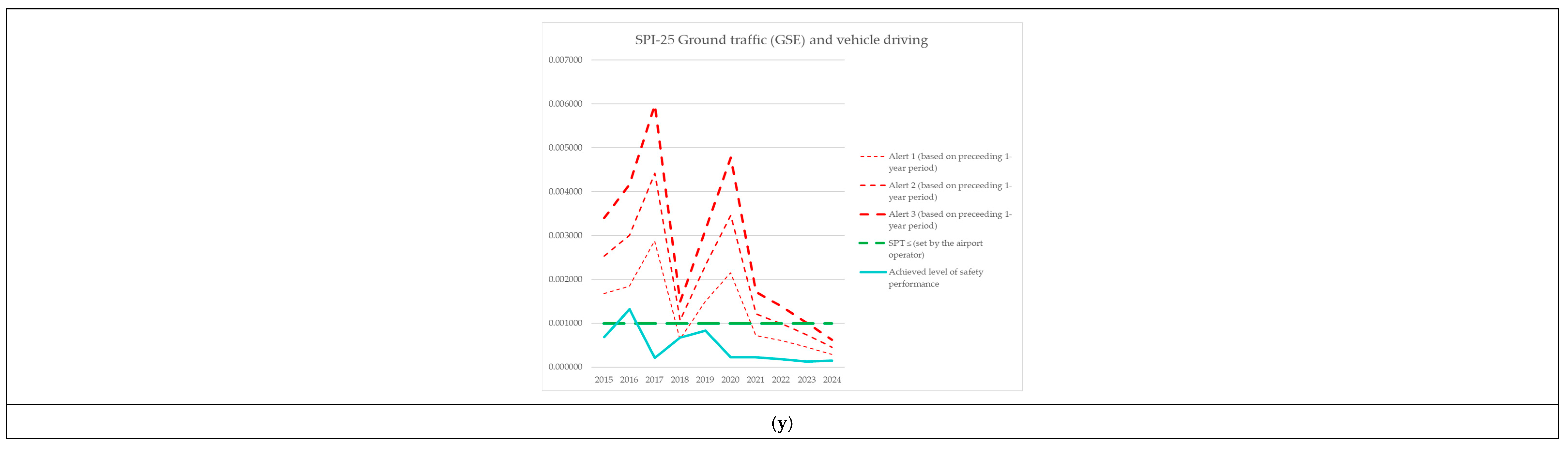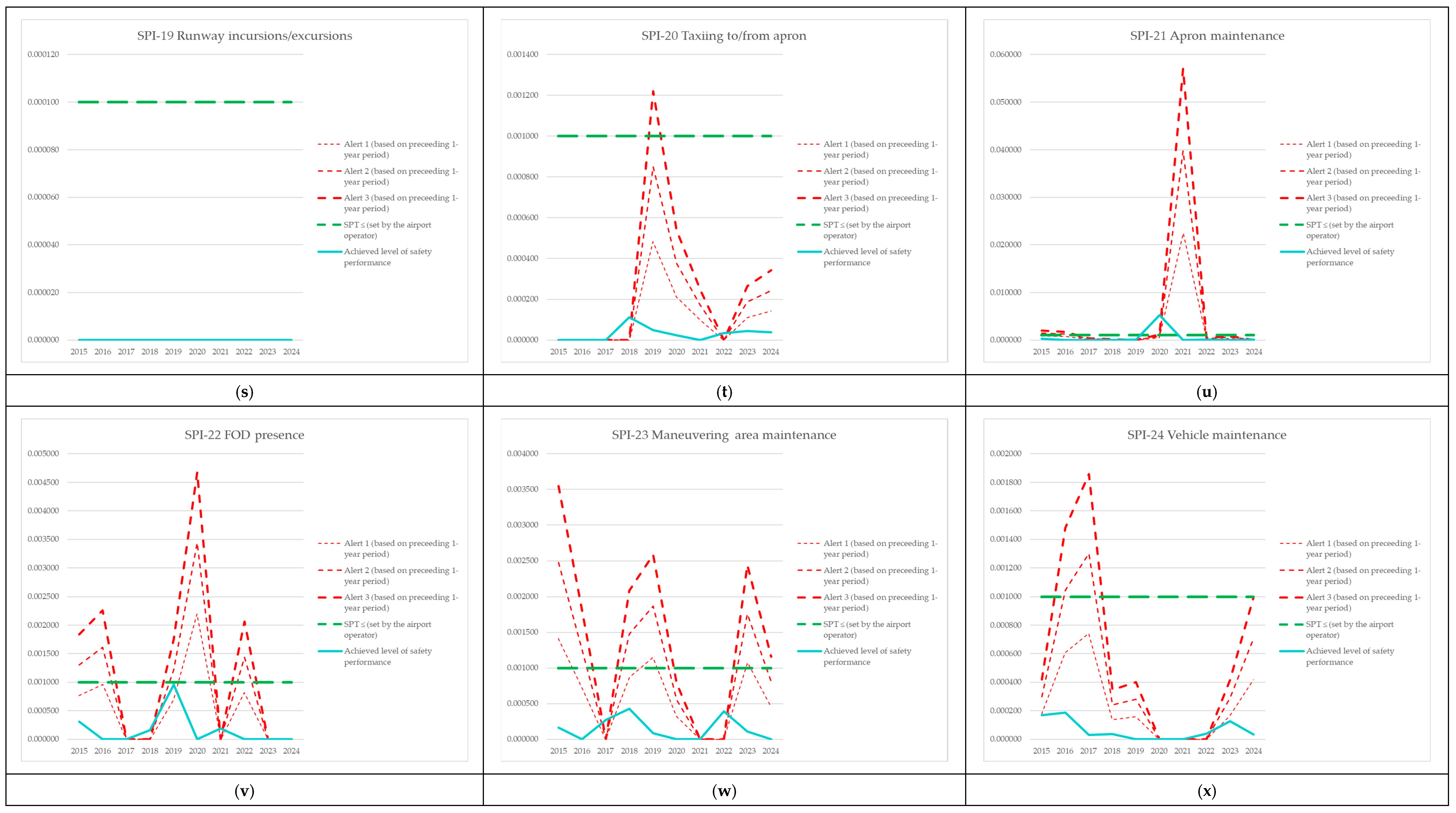 | Year | Alert 1 (Based on Preceding 1-Year Period) | Alert 2 (Based on Preceding 1-Year Period) | Alert 3 (Based on Preceding 1-Year Period) | SPT ≤ (Set by the Airport Operator) | Achieved Level of Safety Performance |