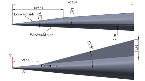 The geometric dimensions of the fin–cone model are shown in Figure 2. The model consists of a single-sided swept delta fin and a non-axisymmetric cone, with an overall length of 452.34 mm and a nose radius of Rn = 2.34 mm. The fin is located on the right side of the cone; it has a fin sweep angle of 75°, with the fin root leading edge 99.57 mm away from the cone nose, and the half-span width of the swept fin at the model base is 61.92 mm. An inflection point is located on the upper surface, 189.84 mm from the nose, which is designed to generate expansion waves; the half-cone angles of the two cone segments before and after the inflection point are 7.3° and 4°, respectively, while the lower surface has a half-cone angle of 2.7°. It is worth noting that all experiments were conducted at zero angle of attack, where the upper surface is defined as the leeward side and the lower surface as the windward side. A coordinate system was established with the nose (for the case of Rn = 2.34 mm) as the origin. The model centerline is defined along the central axis of the sharp cone. The X-axis is aligned with the freestream direction (positive downstream), the Y-axis is oriented spanwise along the cone surface (positive toward the fin) and the Z-axis completes the right-handed system.