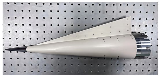 The physical assembly drawing of the fin–cone model is shown in Figure 4. The model comprises four parts: nose, fin–cone body, connecting rod, and base. Among these, the nose, connecting rod, and base are all made of 304 stainless steel and are detachable. The cone body and fin are integrated as a single unit, constructed from PEEK material. The surface roughness of the model is Ra 3.2. For investigating the effects of nose bluntness, four different nose radii, Rn = 0.06 mm, Rn = 0.56 mm, Rn = 1.125 mm, and Rn = 2.34 mm, were designed for replacement, as shown in Figure 5.