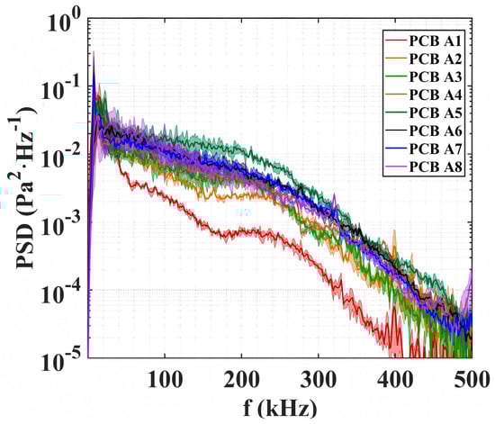 Average PSD with ±1 standard error band for PCB A1–A8, Rn = 0.06 mm, Re∞ = 6.09 × 106 m−1.