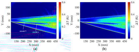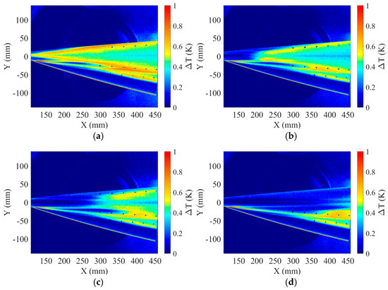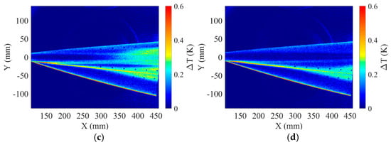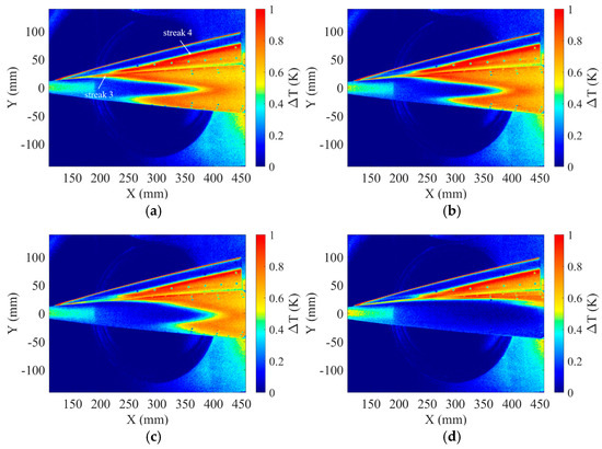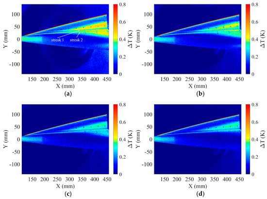 The IR thermography measurements are performed using IRMC-615BB system (IRSV, Beijing, China). This device has a temperature resolution of less than 20 mK, a frame rate of 200 Hz, and a pixel resolution of 640 × 512. When the flow transitions from laminar to turbulent, the convective heat transfer coefficient increases sharply, leading to a rapid rise in the model surface temperature. This abrupt temperature change serves as a key criterion for determining the boundary-layer transition location. By calculating the difference between IR images captured before and after the wind tunnel operation, the model surface temperature rise (∆T) can be obtained. A calcium fluoride IR viewing window was used in the experiment to meet the requirements of optical measurements.