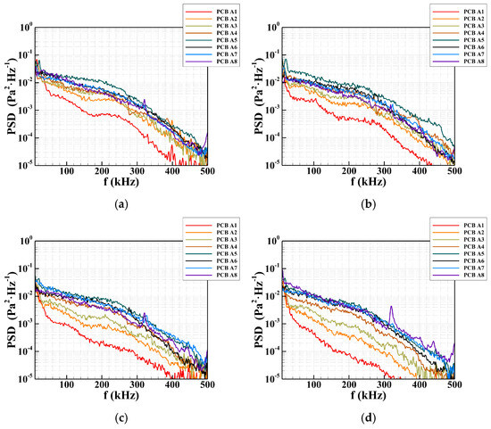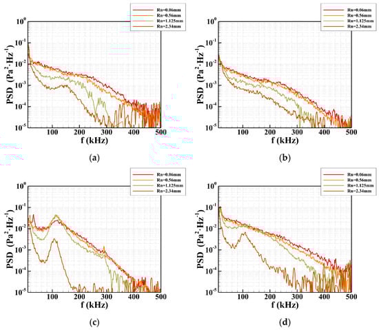 PSD results for the A sensor ray, Re∞ = 6.09 × 106 m−1: (a) Rn = 0.06 mm; (b) Rn = 0.56 mm; (c) Rn = 1.125 mm; (d) Rn = 2.34 mm.