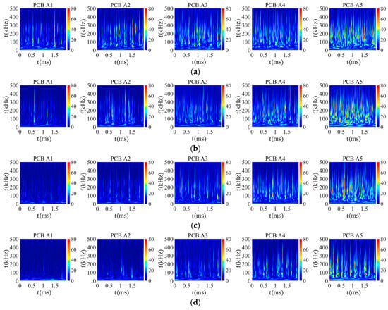 CWT results at PCB A1–A5, Re∞ = 6.09 × 106 m−1: (a) Rn = 0.06 mm; (b) Rn = 0.56 mm; (c) Rn = 1.125 mm; (d) Rn = 2.34 mm.