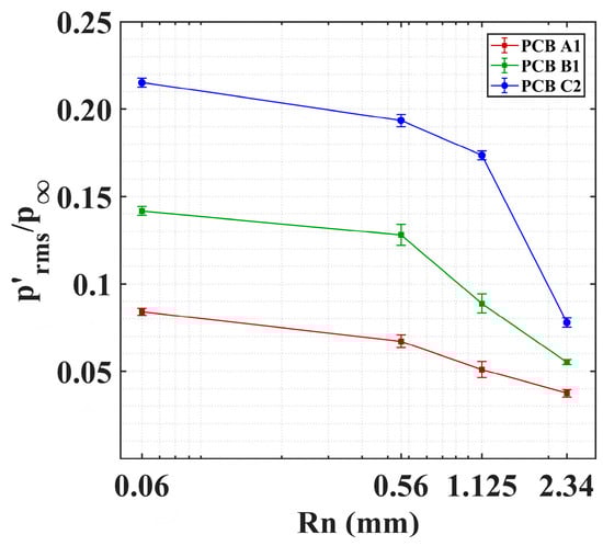 Figure 14 presents the variation in the normalized Root Mean Square (RMS) value of pressure fluctuations with nose bluntness at representative sensor locations along rays A, B, and C (A1, B1, C2). Error bars in the figure indicate ±1 standard error. The RMS pressure fluctuations were obtained by integrating the PSD over the frequency range of 30–500 kHz and were subsequently normalized by the freestream static pressure. The results show that as the measurement locations move farther away from the fin–cone corner (from A1 to C2), the suppression of disturbance energy by increasing nose bluntness becomes significantly stronger. When the nose bluntness increases from Rn = 0.06 mm to Rn = 2.34 mm, the normalized RMS of pressure fluctuations decreases by approximately 55.4% at PCB A1 and reaches a reduction of 63.8% at PCB C2. This quantitative result demonstrates that, within the WSC-L region, the stabilizing effect of increased nose bluntness on boundary-layer instability intensifies with increasing distance from the fin root. This spatial dependence is likely attributable to the interaction between the fin shock and the cone shock in the fin–cone corner region, which generates a localized high-pressure, high-shear region. This shock structure may physically disrupt the direct influence of the upstream entropy layer on local receptivity processes, thereby potentially weakening the stabilizing effect of the increased nose bluntness in the corner region. In contrast, away from the shock interaction, the entropy layer directly influences boundary layer development, allowing the thickening from increased bluntness to fully exert its stabilizing effect and suppress instability waves.