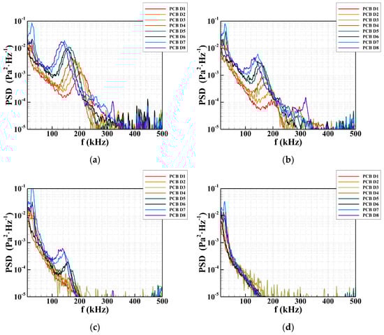 PSD results for the D sensor ray, Re∞ = 6.09 × 106 m−1: (a) Rn = 0.06 mm; (b) Rn = 0.56 mm; (c) Rn = 1.125 mm; (d) Rn = 2.34 mm.