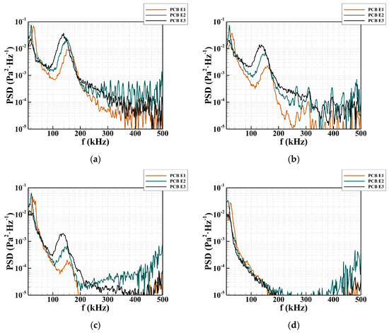 PSD results for the E sensor ray, Re∞ = 6.09 × 106 m−1: (a) Rn = 0.06 mm; (b) Rn = 0.56 mm; (c) Rn = 1.125 mm; (d) Rn = 2.34 mm.