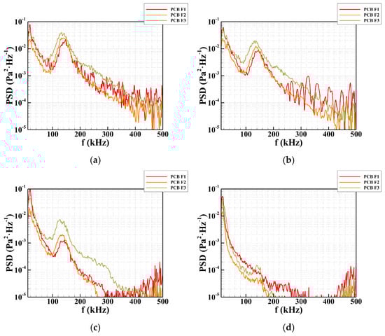 PSD results for the F sensor ray, Re∞ = 6.09 × 106 m−1: (a) Rn = 0.06 mm; (b) Rn = 0.56 mm; (c) Rn = 1.125 mm; (d) Rn = 2.34 mm.