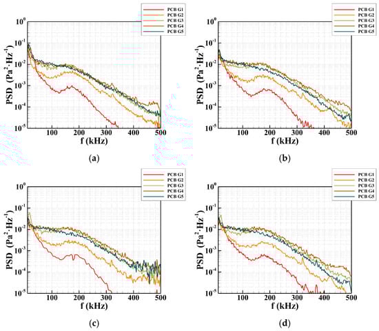 PSD results for the G sensor ray, Re∞ = 6.09 × 106 m−1: (a) Rn = 0.06 mm; (b) Rn = 0.56 mm; (c) Rn = 1.125 mm; (d) Rn = 2.34 mm.