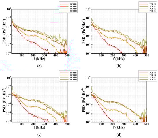 PSD results for the H sensor ray, Re∞ = 6.09 × 106 m−1: (a) Rn = 0.06 mm; (b) Rn = 0.56 mm; (c) Rn = 1.125 mm; (d) Rn = 2.34 mm.