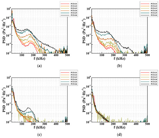 PSD results for the J sensor ray, Re∞ = 6.09 × 106 m−1: (a) Rn = 0.06 mm; (b) Rn = 0.56 mm; (c) Rn = 1.125 mm; (d) Rn = 2.34 mm.