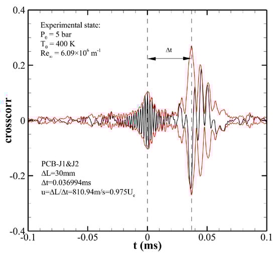 Figure 15, Figure 16 and Figure 17 show, respectively, the PSD results measured along D, E, and F sensor rays on the fin-off side of the cone. The phenomena observed along the three rays are relatively similar. When Rn = 0.06 mm, Rn = 0.56 mm, and Rn = 1.125 mm, the instability waves and their development process along the downstream direction can be observed very clearly. As the flow develops downstream, the amplitude of the instability waves generally shows an increasing trend; meanwhile, as the boundary layer thickens, its peak frequency decreases significantly, which is consistent with the characteristics of typical second-mode instability. Cross-correlation analysis was performed on the signals from adjacent sensors PCB D1 and D2 to obtain the propagation velocity of the instability waves, Rn = 0.56 mm taken as the representative case. The distance between the two sensors is = 22.5 mm. As shown in Figure 18, the cross-correlation peak yields a time lag = 0.02916 ms. The velocity at the outer edge of the boundary layer is to be about Ue = 831.68 m/s. The computed propagation speed is u = 771.6 m/s, approximately 92.8% of Ue. This value lies within the theoretical slow-mode phase-velocity range of the second mode, [], providing further confirmation that the observed instability waves are second-mode waves. The central frequency of these instability waves ranges from 100 to 200 kHz. As the nose radius increases, the amplitude of the instability waves at the same PCB location decreases significantly, and their onset is also delayed. When the nose radius increases to Rn = 2.34 mm, the instability waves have barely developed; only a weak peak appears at PCB F2 and F3.